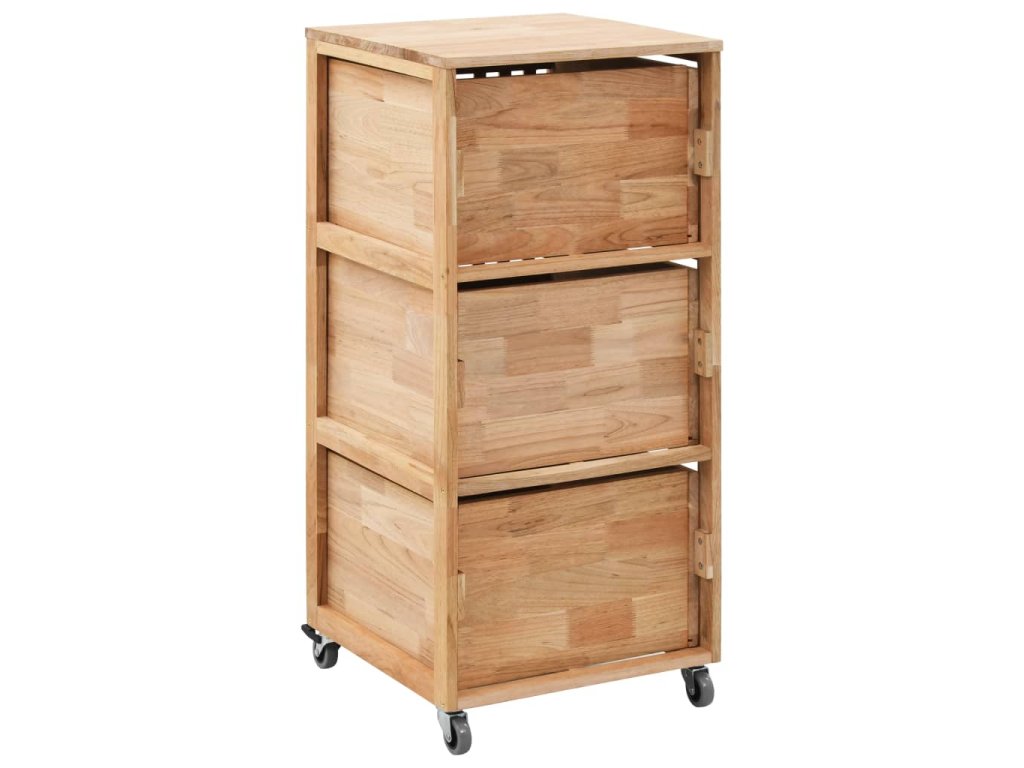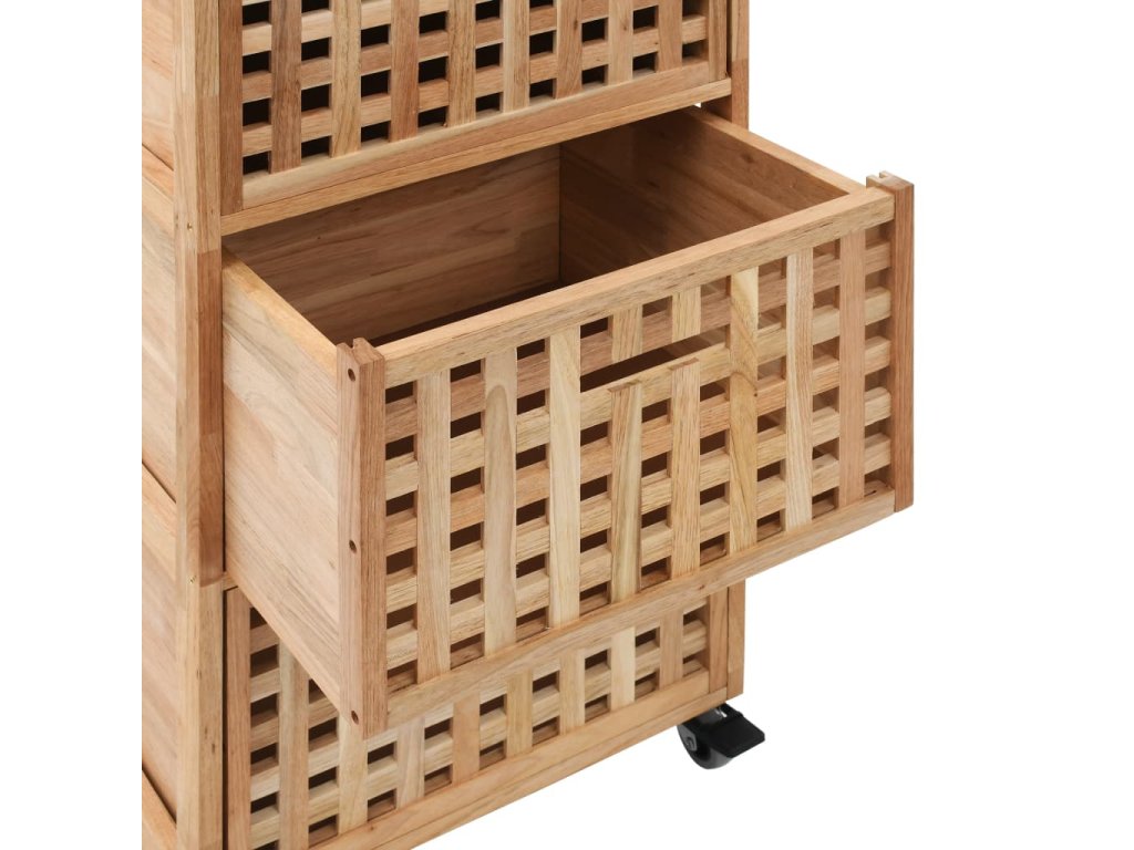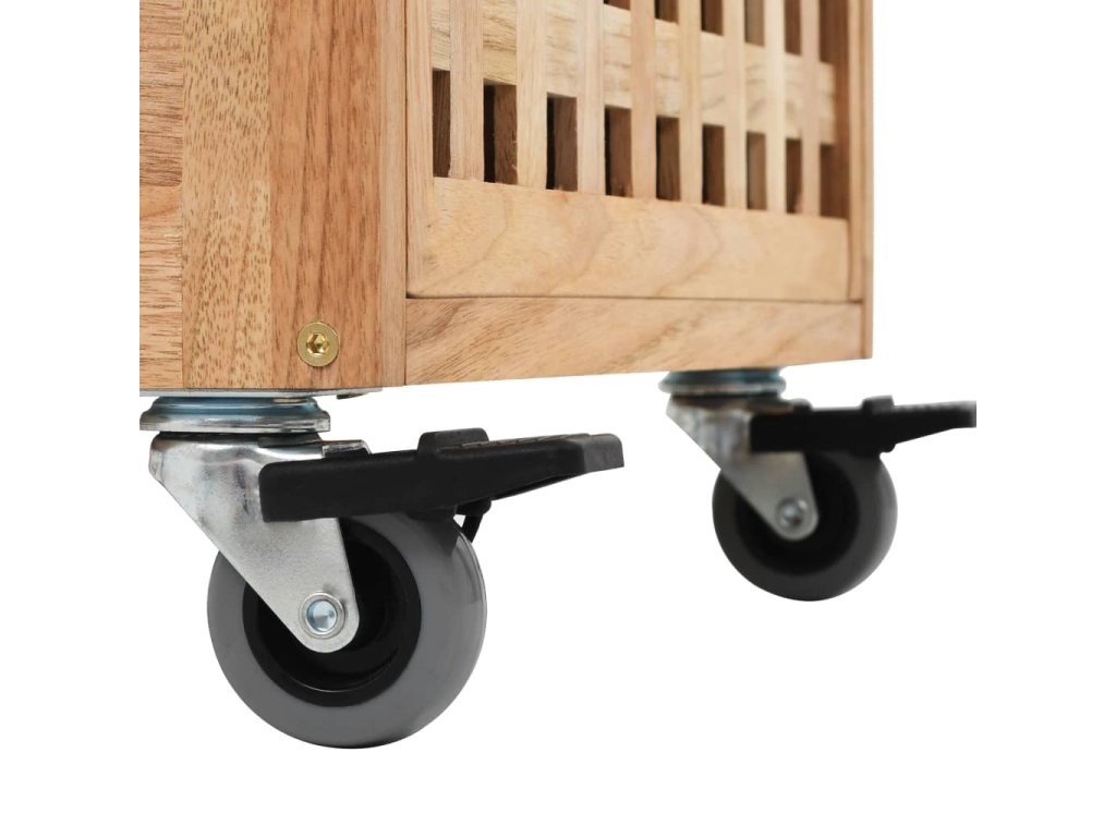 Koupelnová skříňka obsahuje tři koše, které vám poskytnou spoustu místa na ukládání věcí, jako jsou ručníky, špinavé prádlo, hygienické potřeby atd. Mřížkovaný design umožňuje dobré větrání věcí uvnitř koše. Skříňka je vyrobena z masivního ořechového dřeva a překližky, takže je velmi robustní a odolná. Čtyři kolečka usnadňují přesouvání skříňky z jednoho místa na druhé.