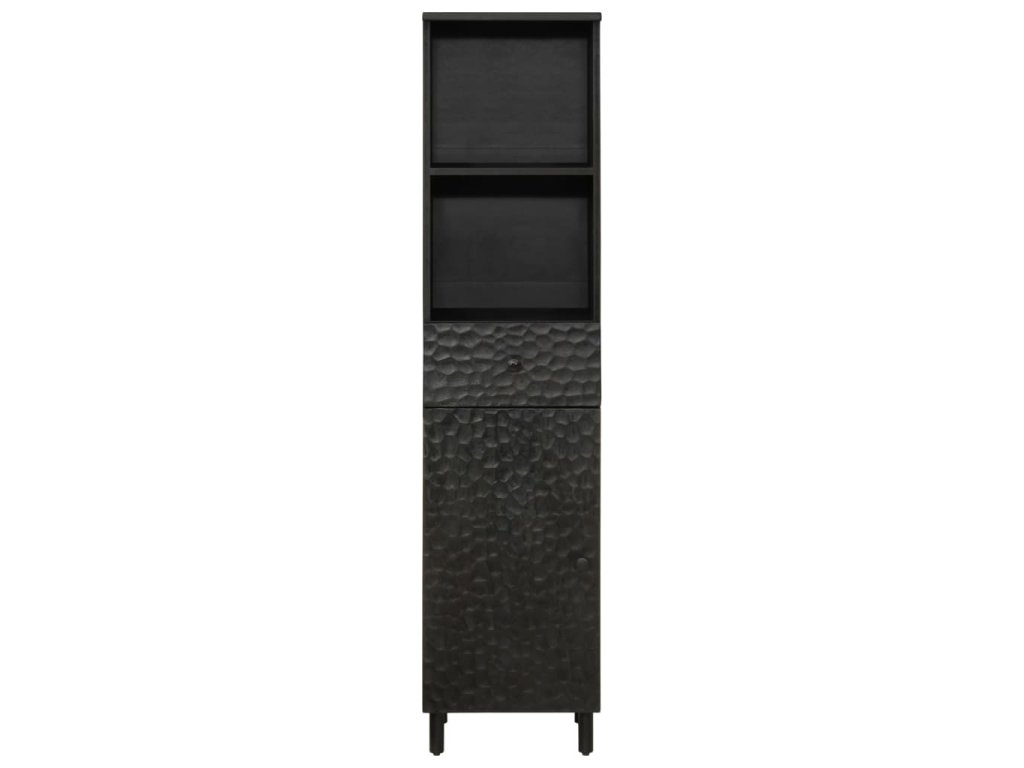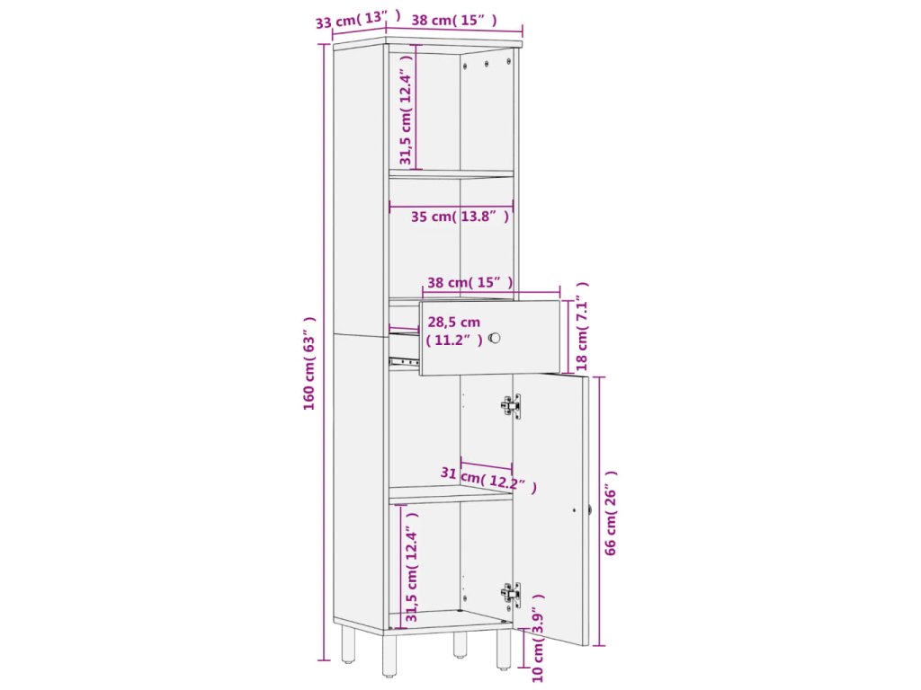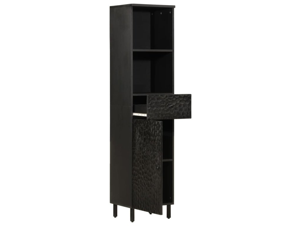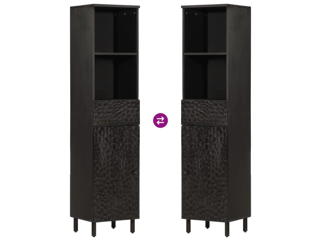 - Masivní mangovníkové dřevo: Masivní mangovníkové dřevo je pevné tropické tvrdé dřevo, ze kterého se vyrábí robustní nábytek. Krásná kresba dřeva propůjčuje každému kusu nábytku jeho jedinečný a od všech ostatních lehce odlišný vzhled. Úložná skříňka do koupelny je vyrobená z masivního mangovníkového dřeva, je tedy stabilní a odolná.