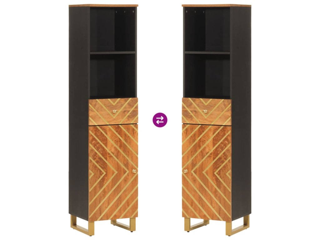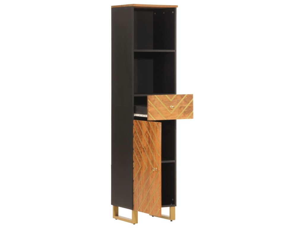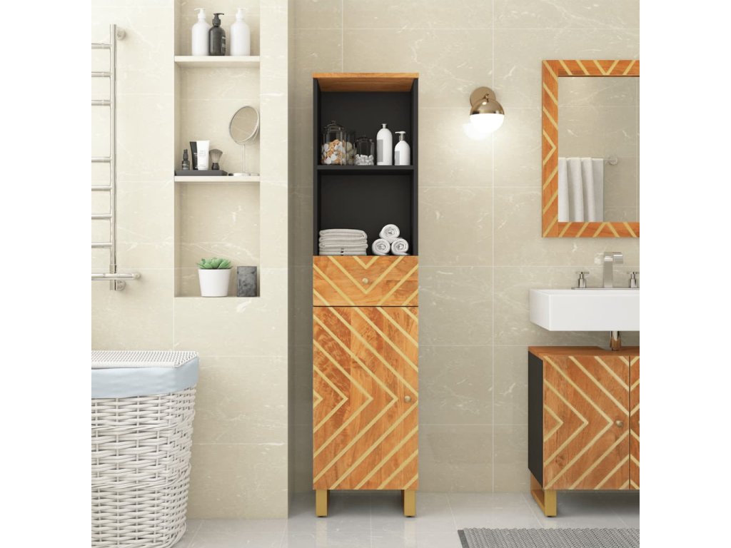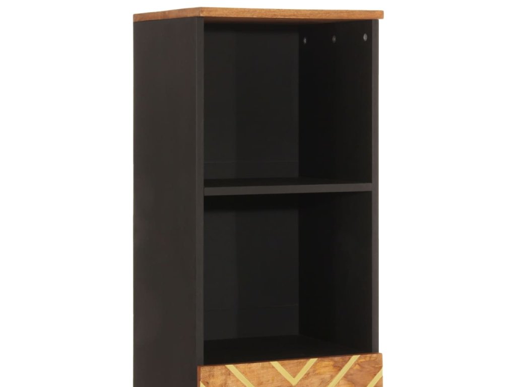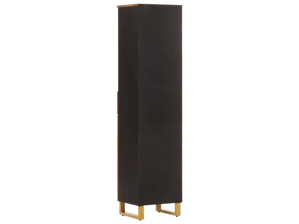 - Masivní mangovníkové dřevo: Masivní mangovníkové dřevo je pevné tropické tvrdé dřevo, ze kterého se vyrábí robustní nábytek. Krásná kresba dřeva propůjčuje každému kusu nábytku jeho jedinečný a od všech ostatních lehce odlišný vzhled. Úložná skříňka do koupelny je vyrobená z masivního mangovníkového dřeva, je tedy stabilní a odolná.