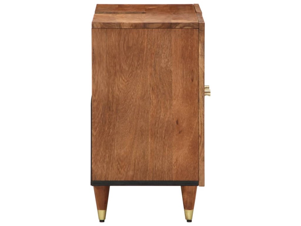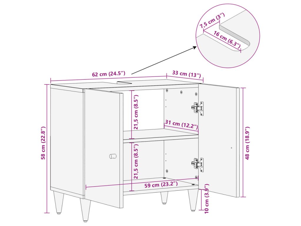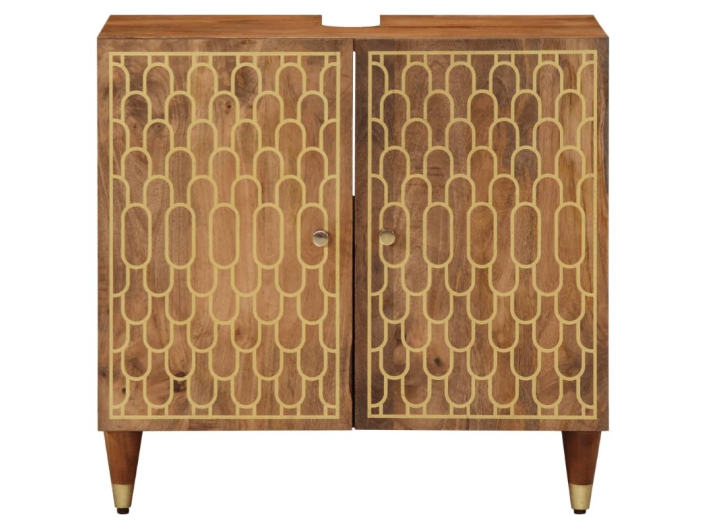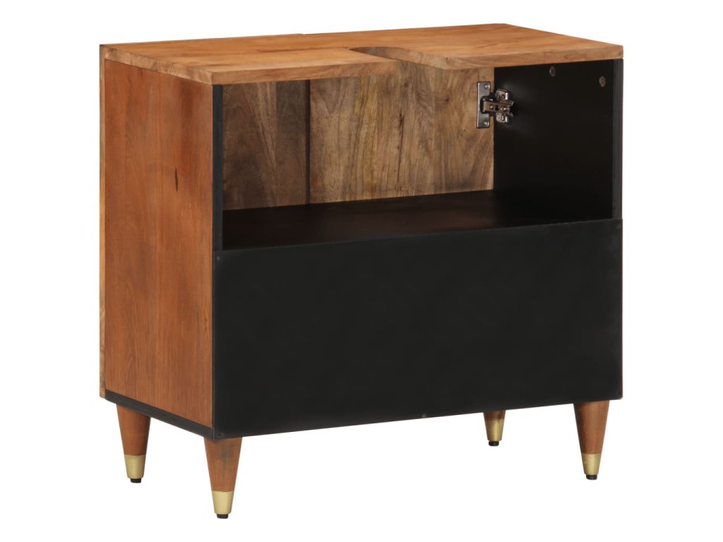 - Masivní mangovníkové dřevo: Masivní mangovníkové dřevo je pevné tropické tvrdé dřevo, ze kterého se vyrábí robustní nábytek. Krásná kresba dřeva propůjčuje každému kusu nábytku jeho jedinečný a od všech ostatních lehce odlišný vzhled. Skříňka pod umyvadlo je vyrobená z masivního mangovníkového dřeva, je tedy stabilní a odolná.