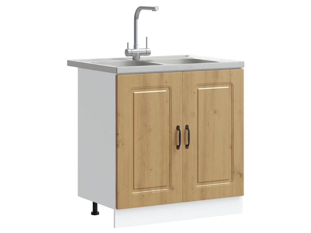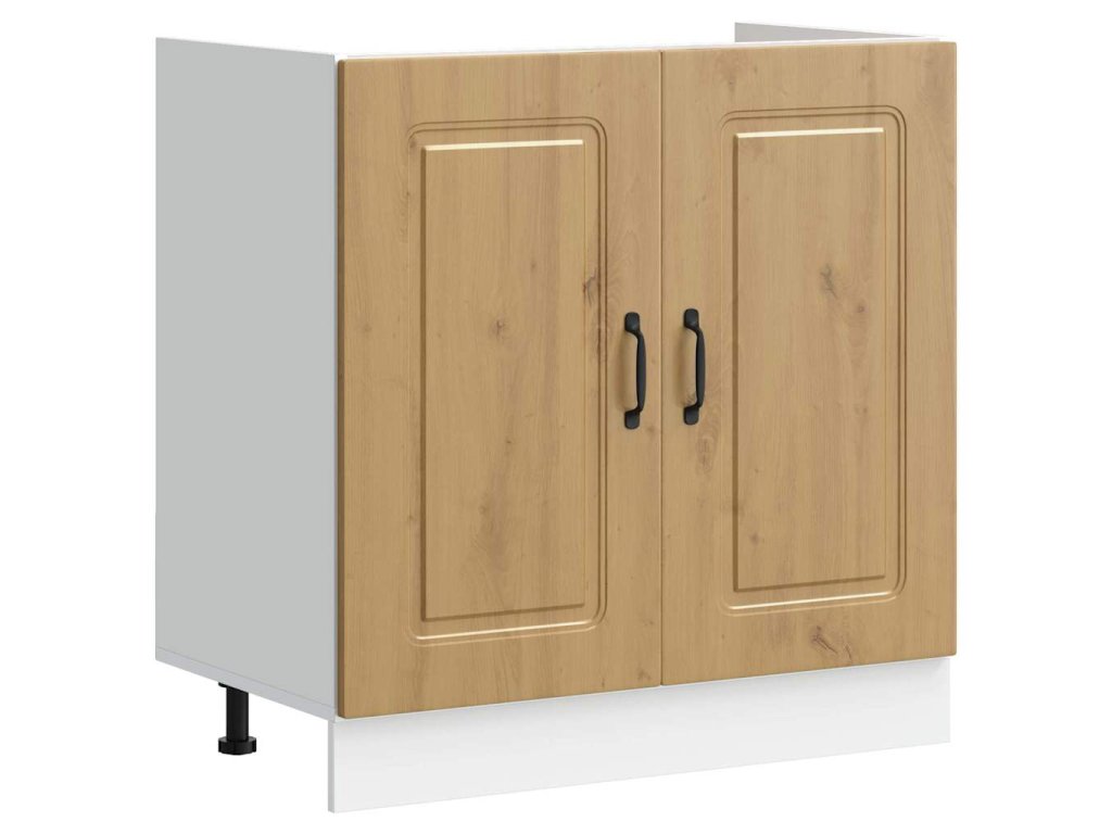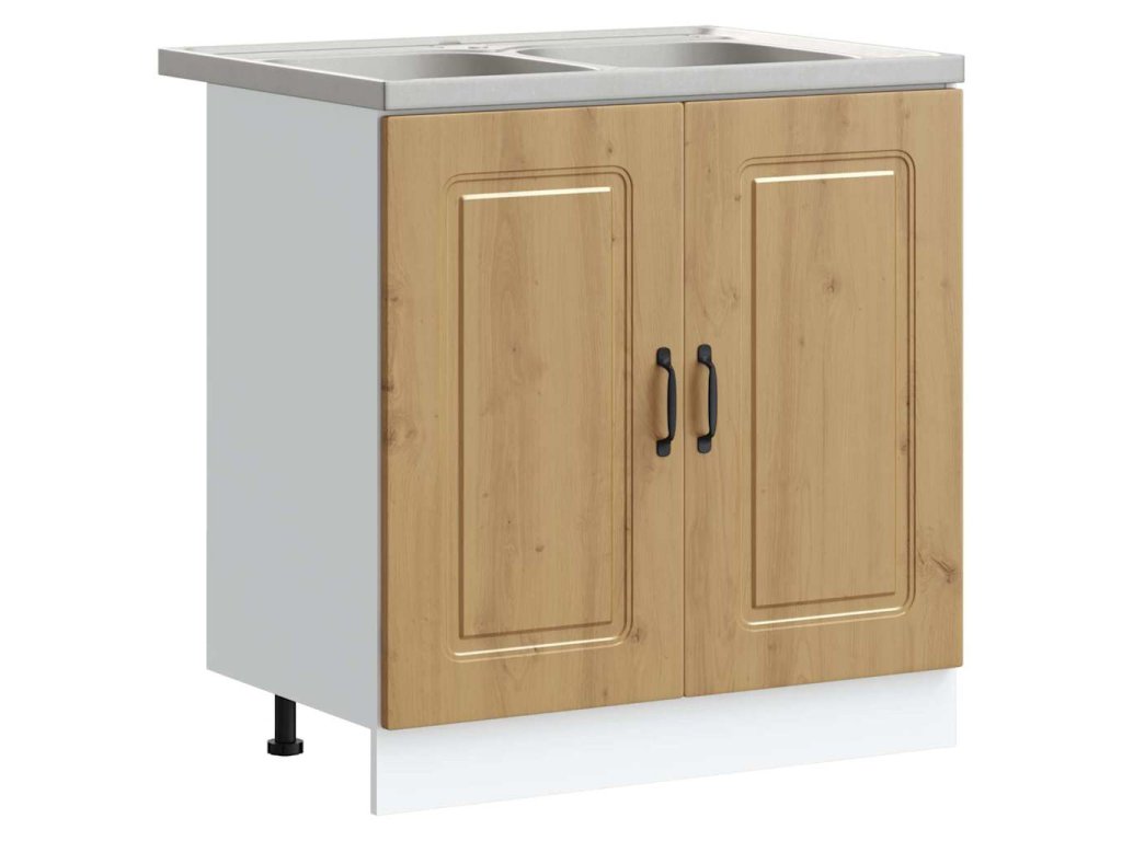 - Součásti: Skříňka má bezfalcové dveře, které zajišťují hladký chod a elegantní vzhled. Černé nohy zajišťují stabilitu a obloukové úchyty poskytnou pohodlné uchopení a kontrast.