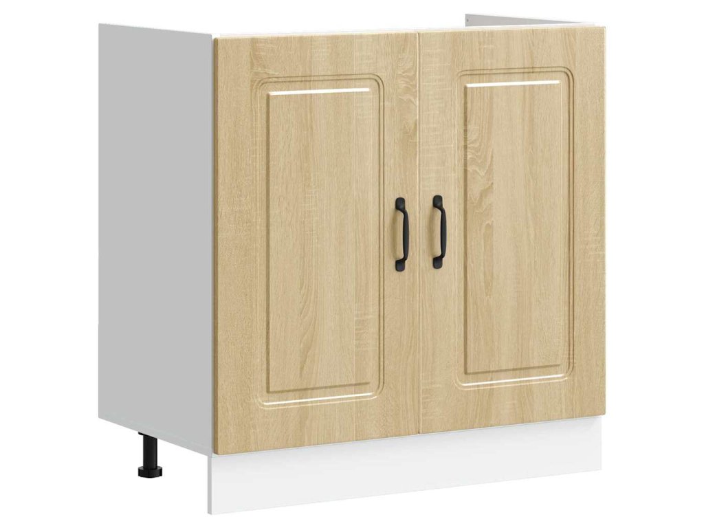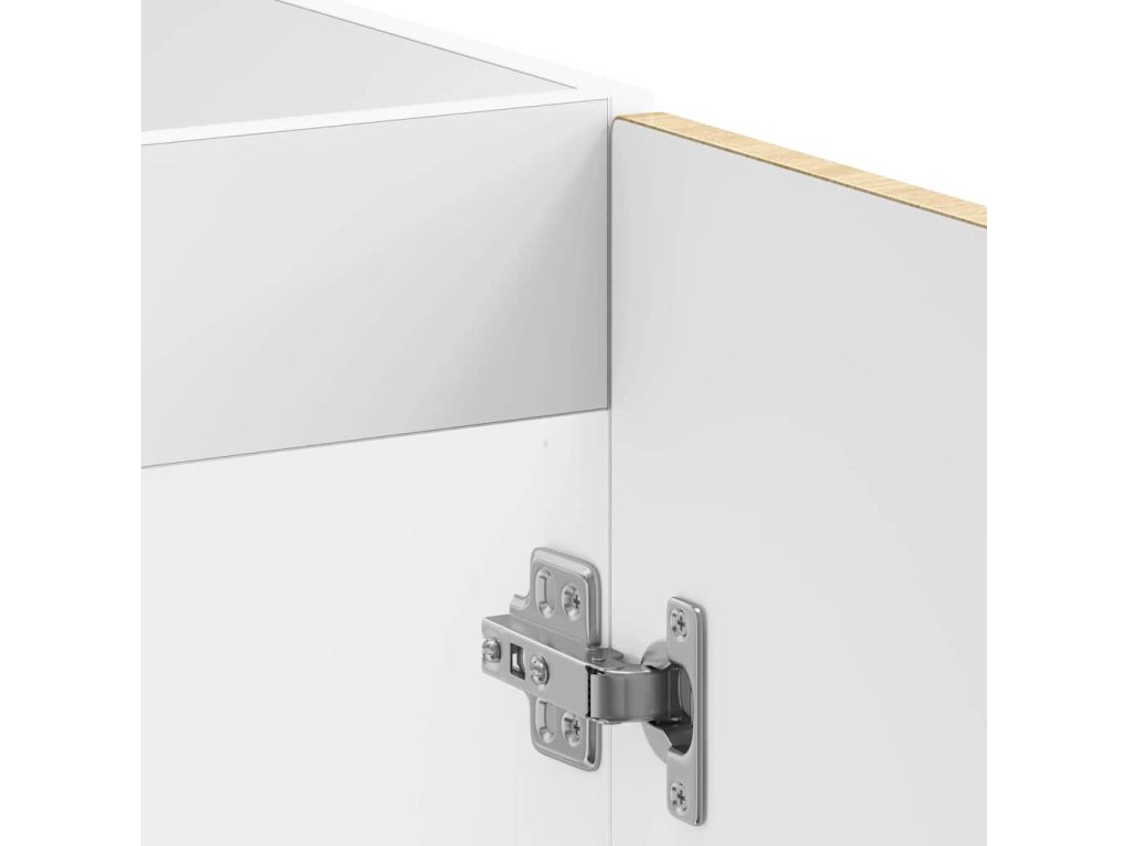 - Součásti: Skříňka má bezfalcové dveře, které zajišťují hladký chod a elegantní vzhled. Černé nohy zajišťují stabilitu a obloukové úchyty poskytnou pohodlné uchopení a kontrast.