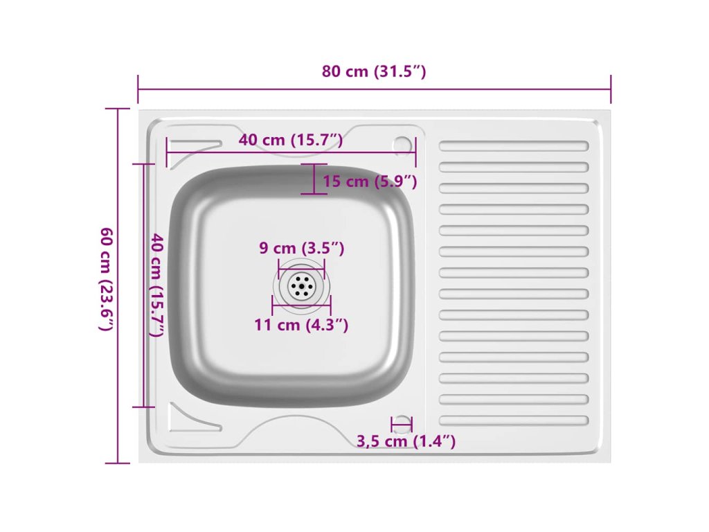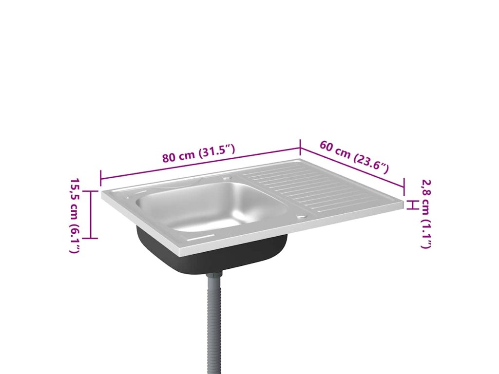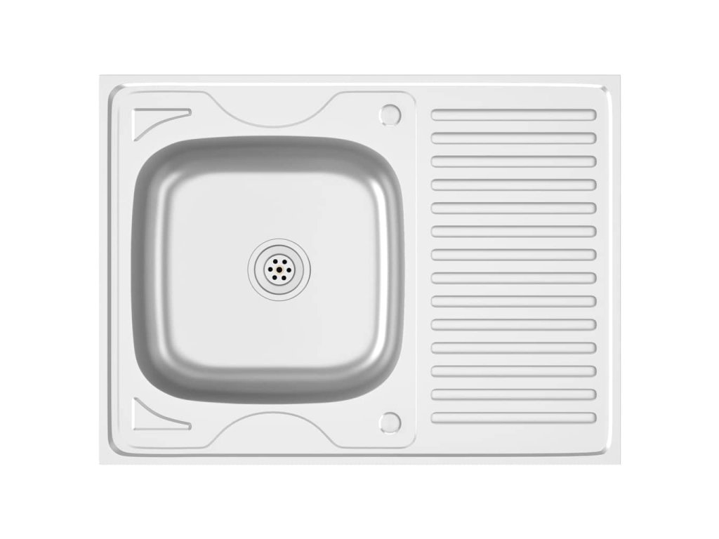 Dřez je vyroben z nerezové oceli, takže výborně vzdoruje teplu, poškrábání a nárazům a také se snadno čistí. Dřez s extra silnými bočními panely je určený pro montáž shora na skříňku. Praktický odkapávač slouží k odkládání umytého nádobí. Je vybaven odtokovým potrubím a otvory na vodovodní baterii na obou stranách, takže se může umístit na jakoukoli stranu.Jelikož je dřez plně oboustranný, lze jej umístit na levou, nebo na pravou stranu.