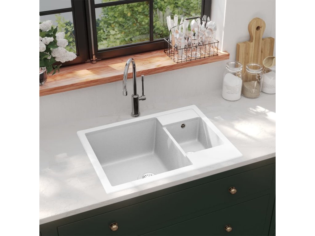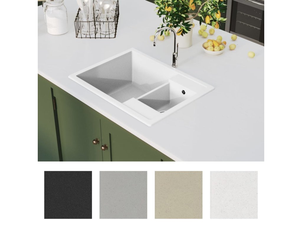 Náš žulový kuchyňský dřez je skvělým nadčasovým doplňkem do vaší kuchyně. Má elegantní design a tvoří ho jeden extra hluboký dřez a jeden malý dřez.