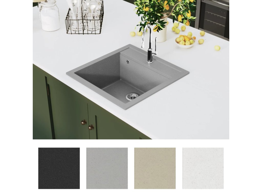 Tento dřez je zhotovený z vysoce kvalitního žulového kamene, jehož zásluhou je odolný vůči teplu, poškrábání a snadno se čistí. Otvor pro instalaci vodovodní baterie je již částečně navrtaný, stačí ho vyklepnout malým kladívkem nebo vhodnou trubkou. Pokud již máte nainstalovanou dřezovou baterii na kuchyňské lince, pak můžete ponechat otvor zakrytý. Součástí balení je též sítko do dřezu.