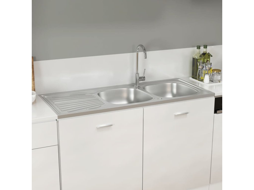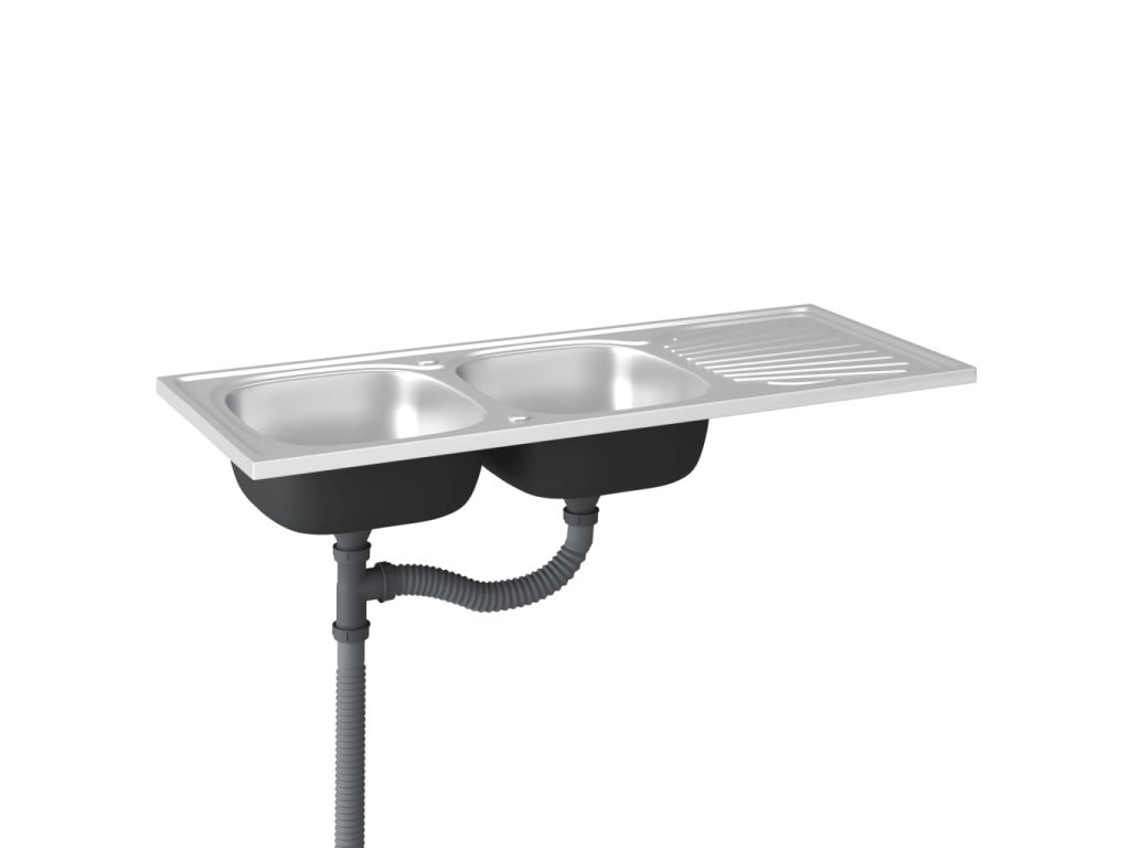 Tento dvojitý kuchyňský dřez s odtokem je nadčasový doplněk do zařízení vaší kuchyně.