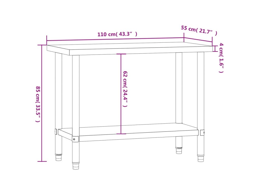 - Nastavitelné nožičky: Nastavitelné nožičky s protiskluzovým provedením zajišťují, že kuchyňský přípravný stůl bude stát pevně na místě a zároveň chrání podlahu před poškozením.