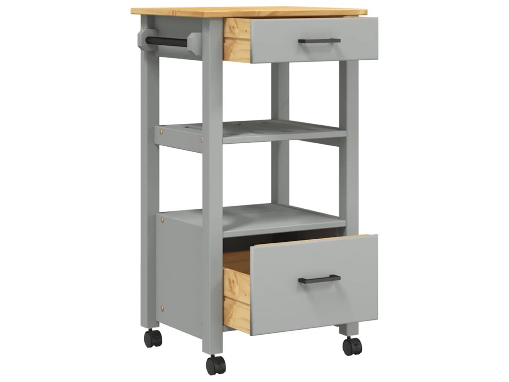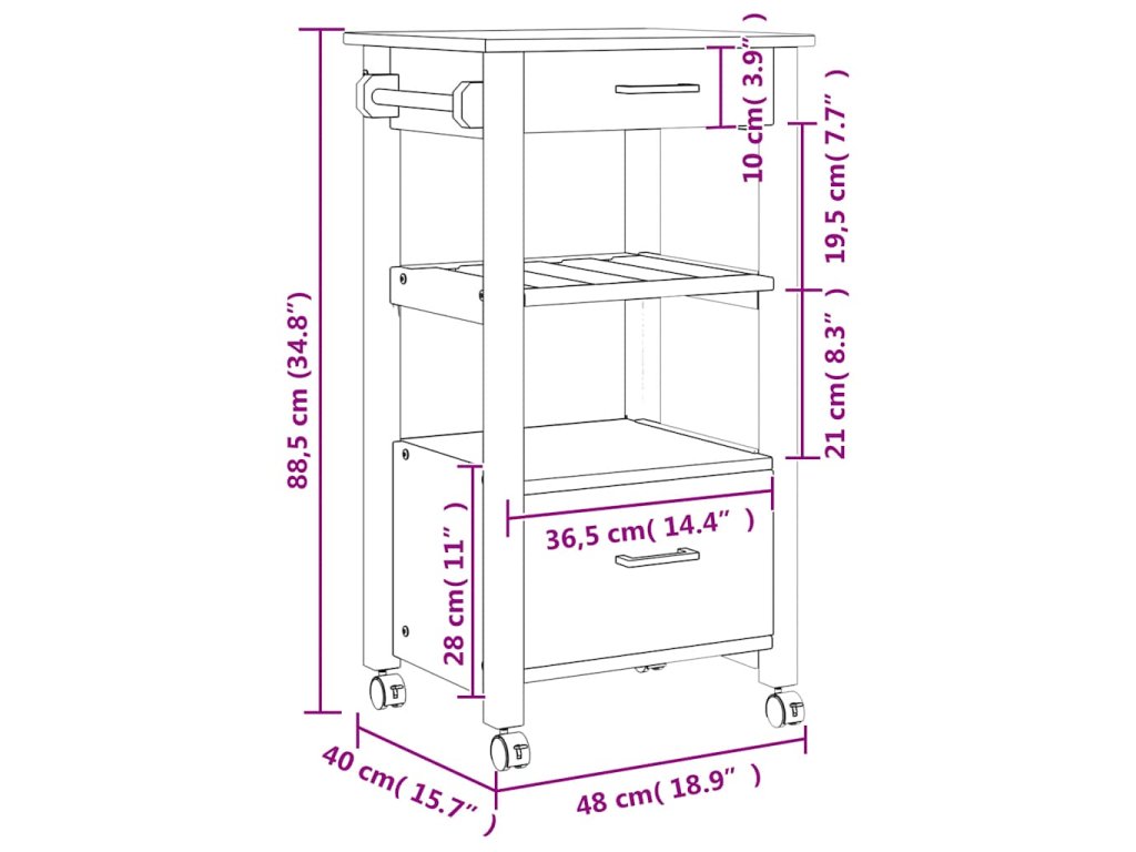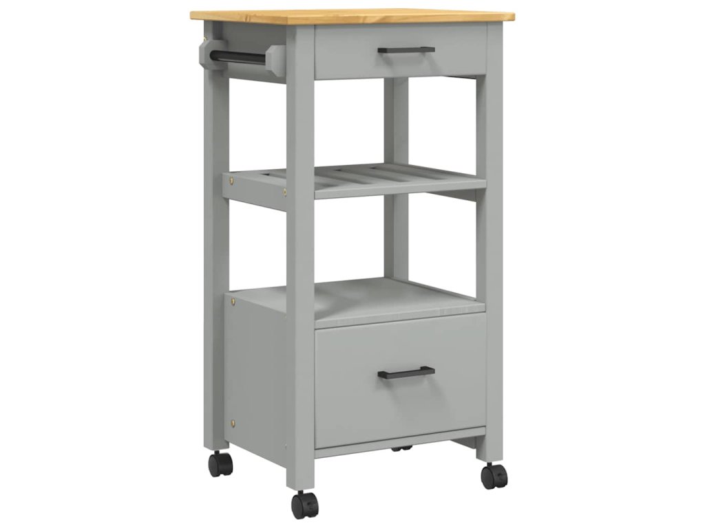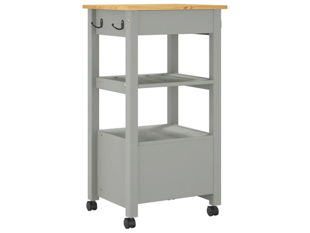 - Odolný rám: Masivní borové dřevo je nádherný přírodní materiál. Borové dřevo má rovnou kresbu a obsahuje suky, které materiálu dodávají jeho charakteristický, rustikální vzhled. Kuchyňský úložný vozík je vyroben z masivního borového dřeva a je odolný a robustní.