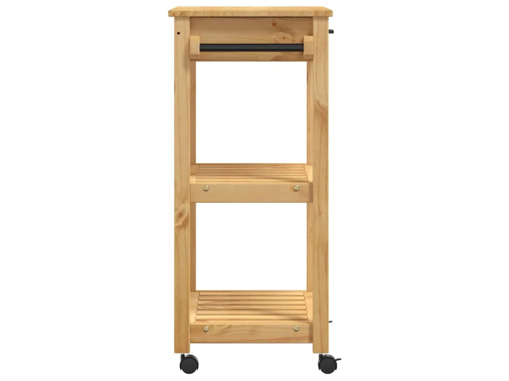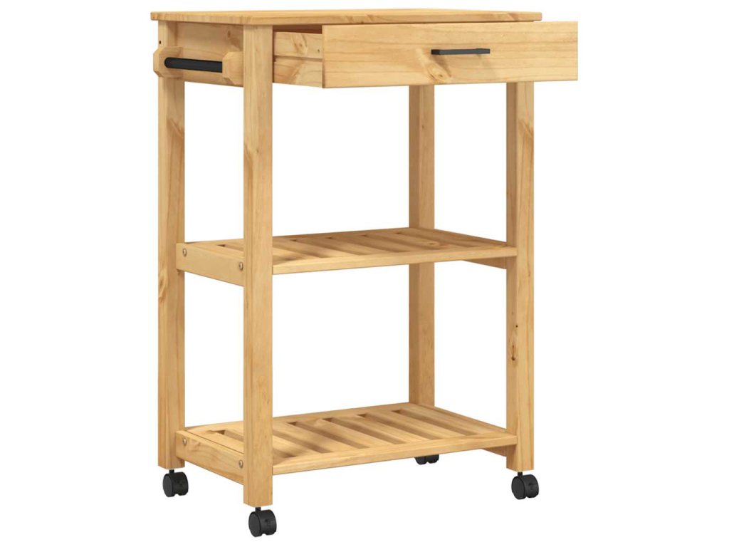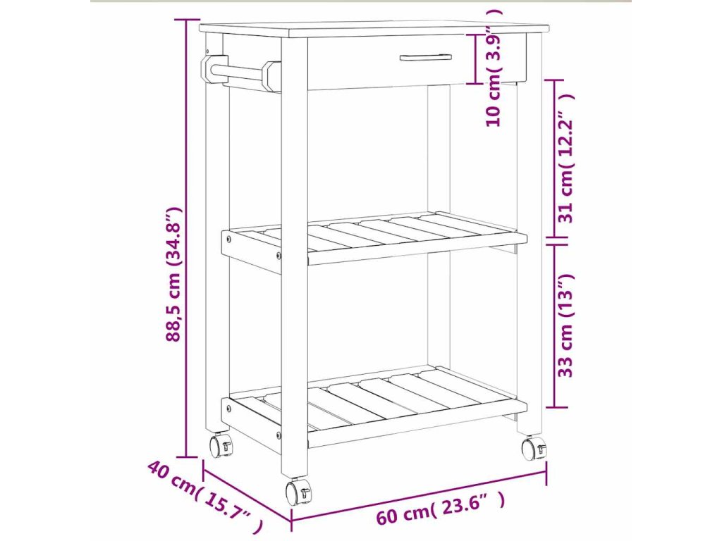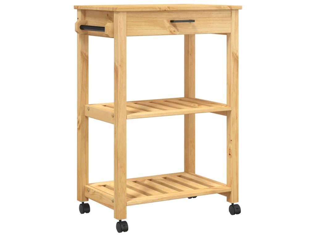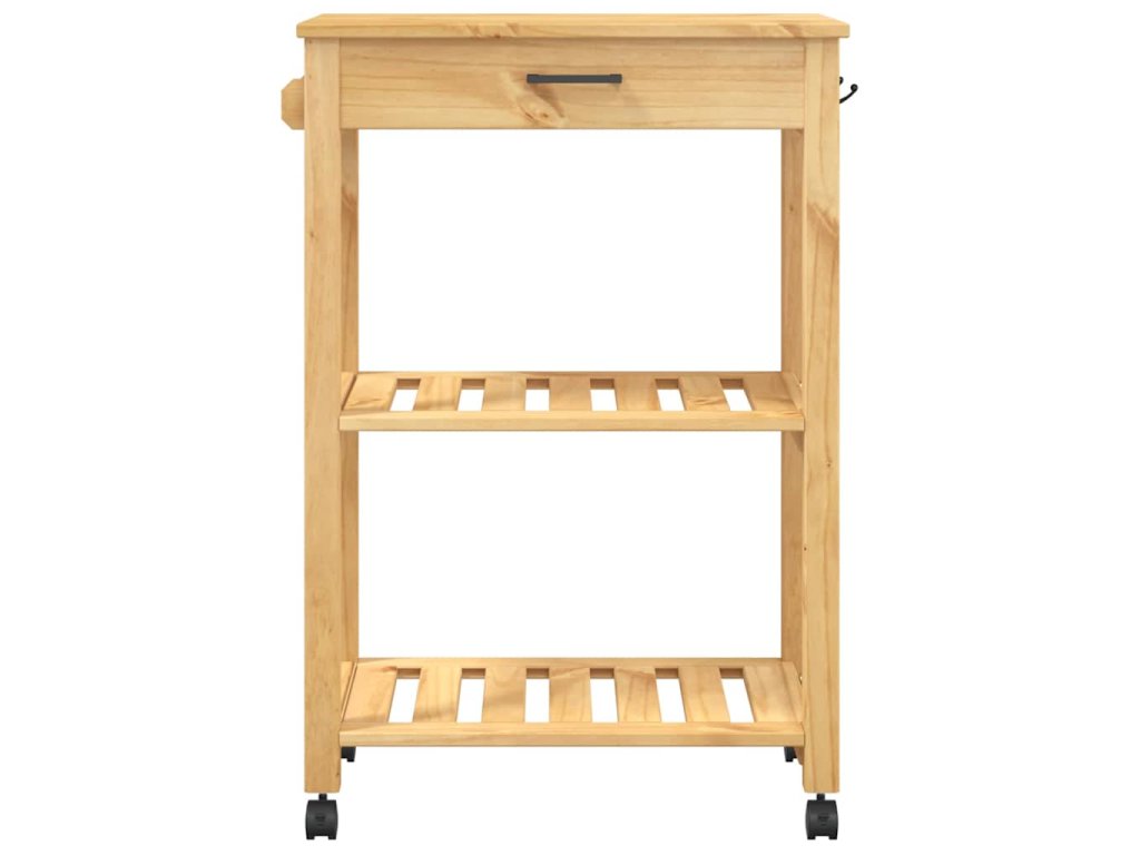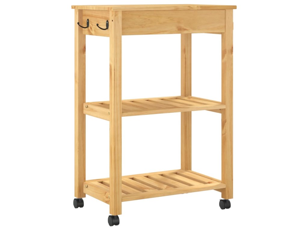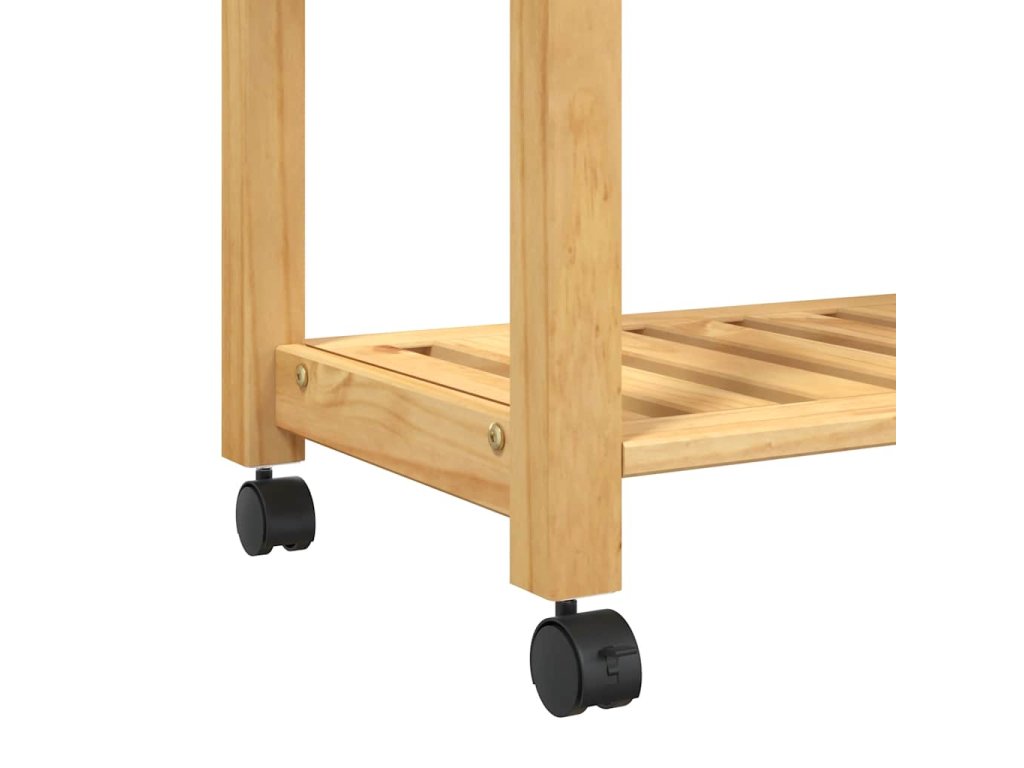 - Odolný rám: Masivní borové dřevo je nádherný přírodní materiál. Borové dřevo má rovnou kresbu a obsahuje suky, které materiálu dodávají jeho charakteristický, rustikální vzhled. Kuchyňský úložný vozík je vyroben z masivního borového dřeva a je odolný a robustní.