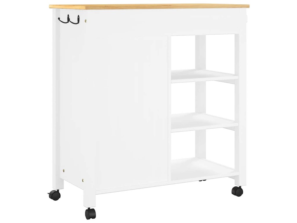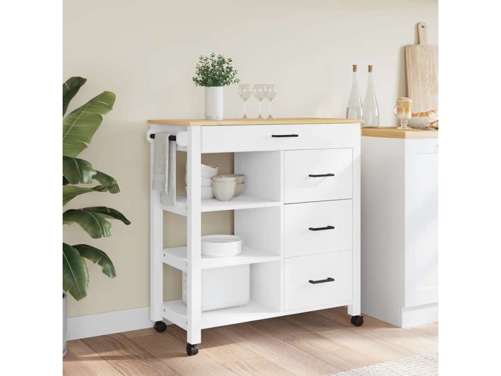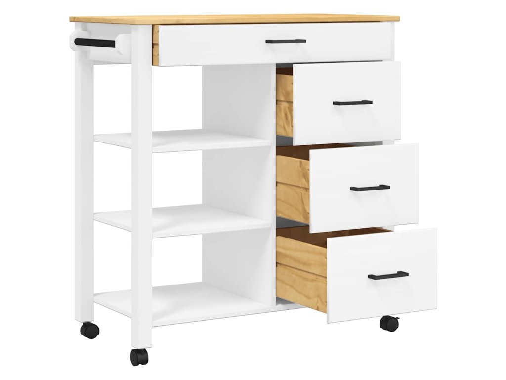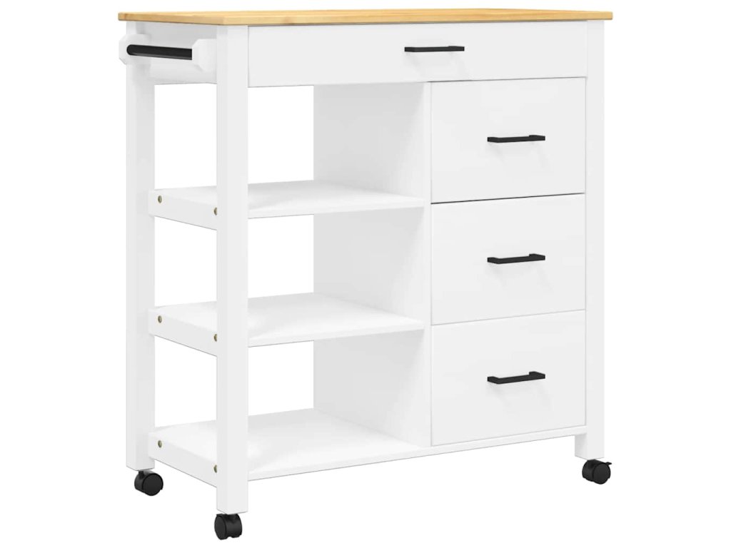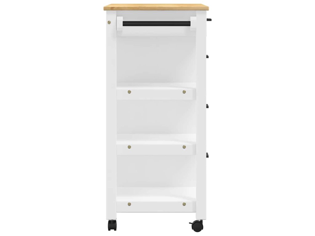- Odolný rám: Masivní borové dřevo je nádherný přírodní materiál. Borové dřevo má rovnou kresbu a obsahuje suky, které materiálu dodávají jeho charakteristický, rustikální vzhled. Kuchyňský úložný vozík je vyroben z masivního borového dřeva a je odolný a robustní.