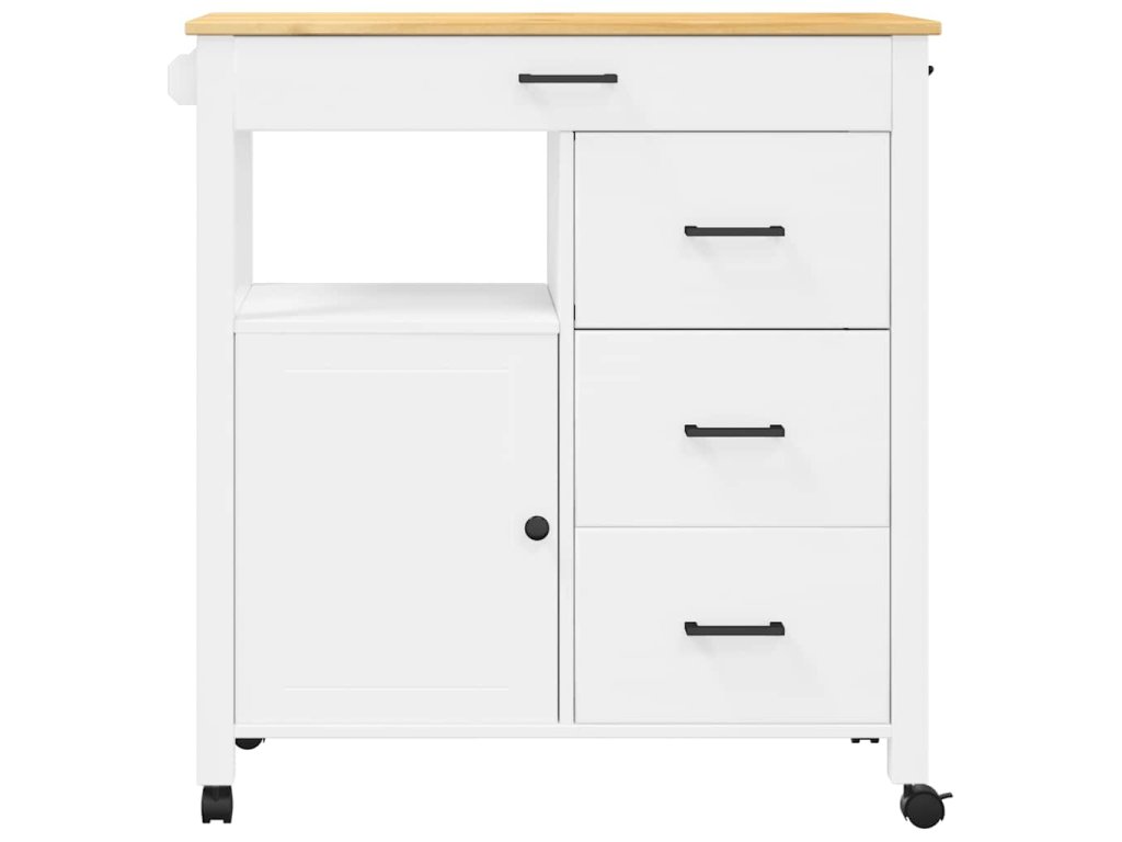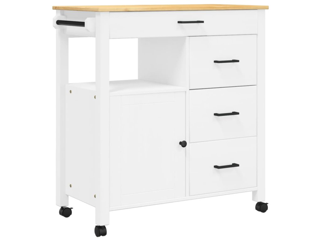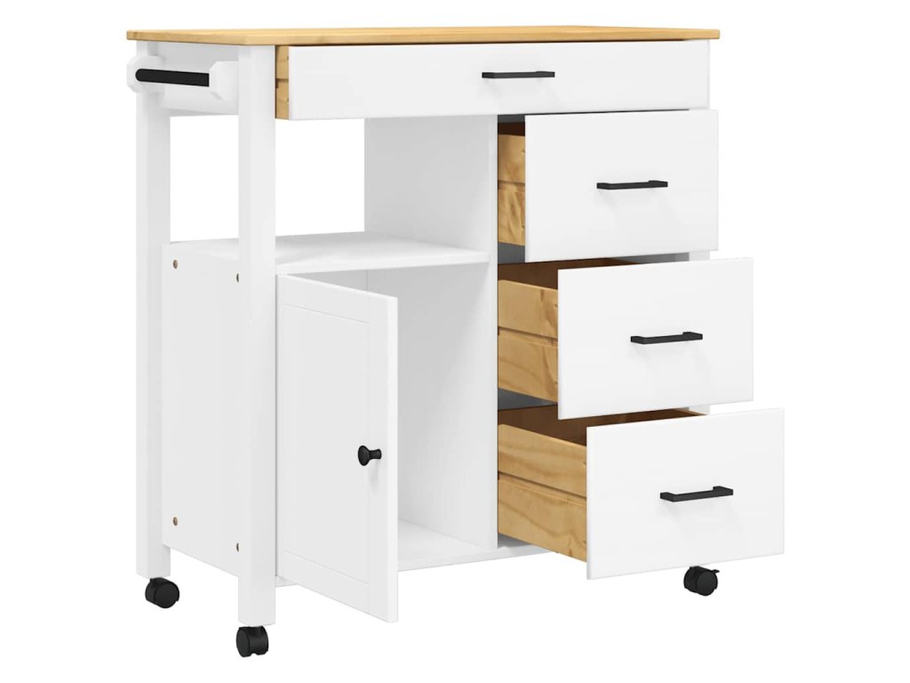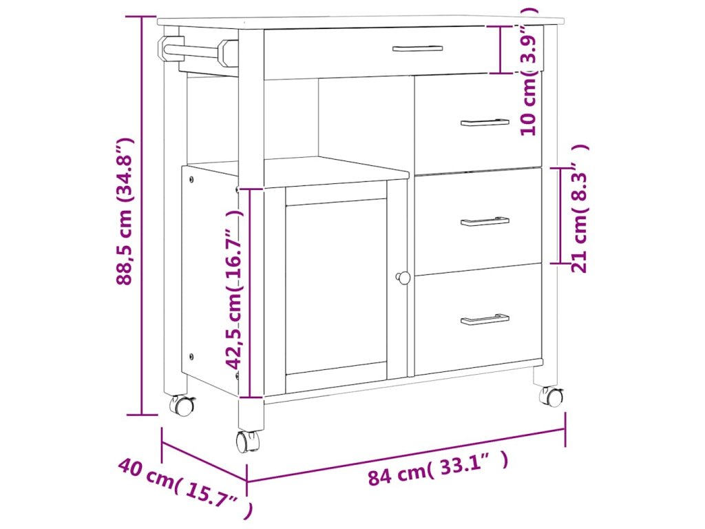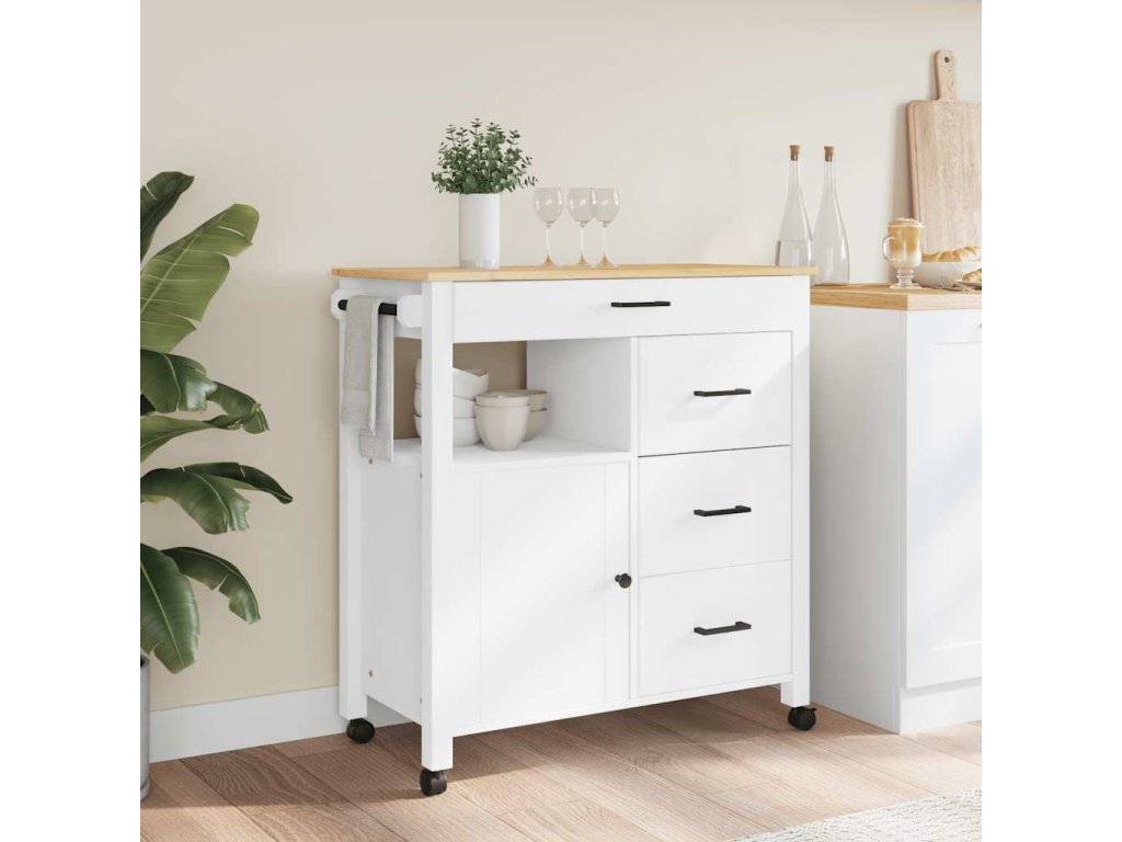 - Odolný rám: Masivní borové dřevo je nádherný přírodní materiál. Borové dřevo má rovnou kresbu a obsahuje suky, které materiálu dodávají jeho charakteristický, rustikální vzhled. Kuchyňský úložný vozík je vyroben z masivního borového dřeva a je odolný a robustní.