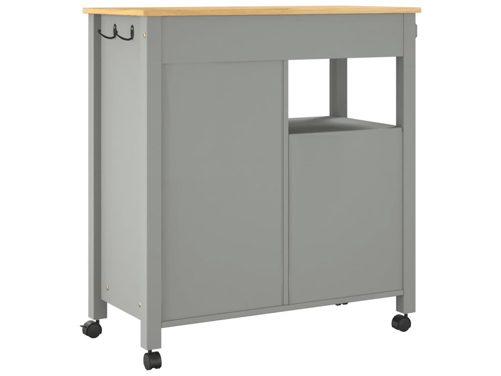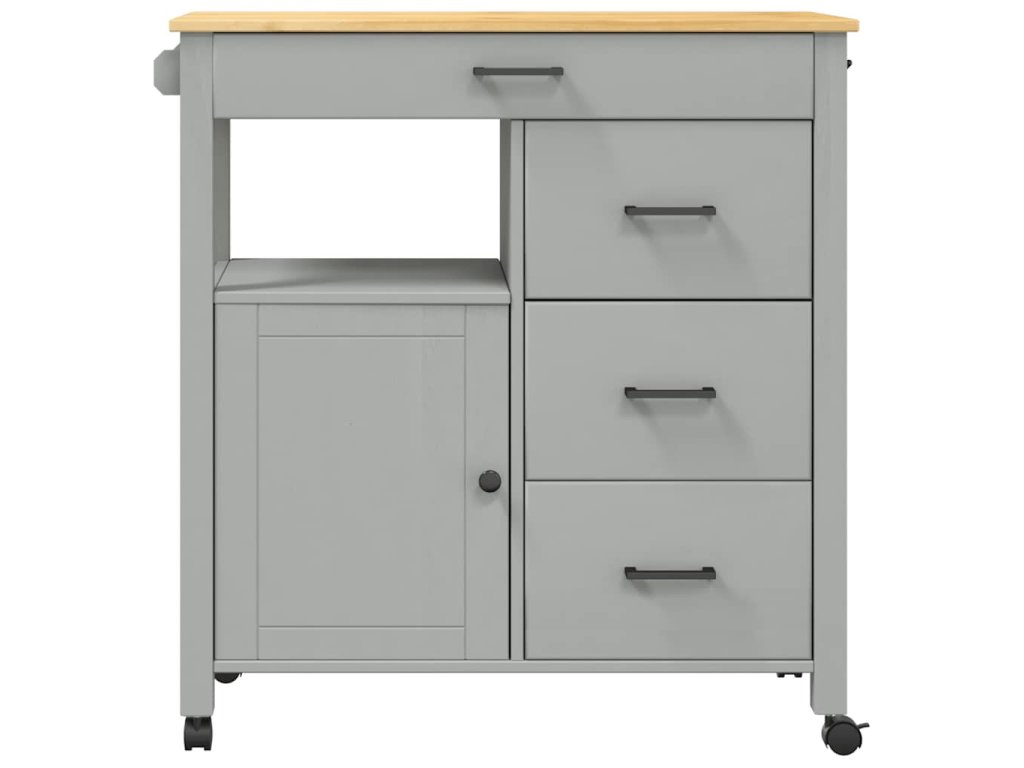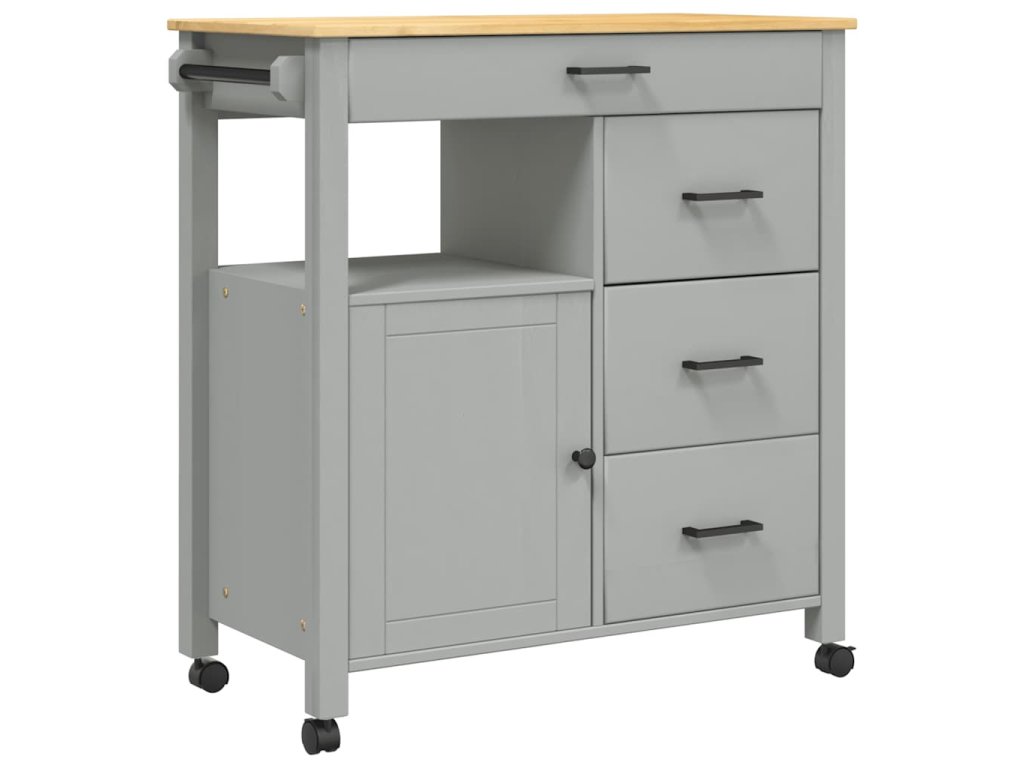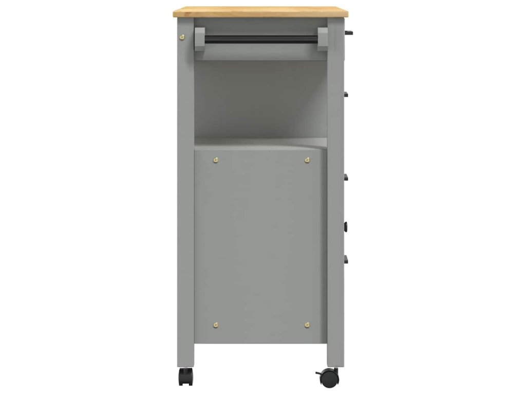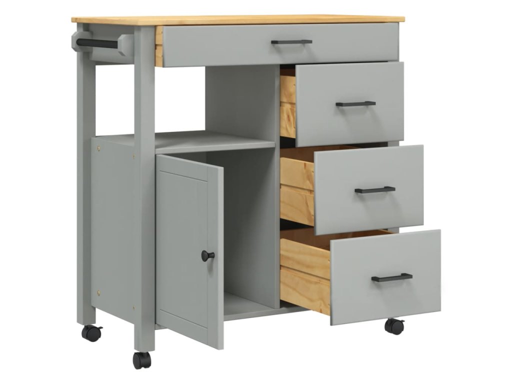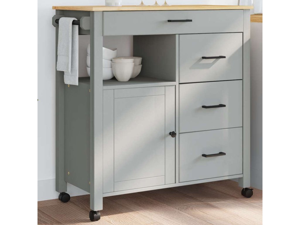 - Odolný rám: Masivní borové dřevo je nádherný přírodní materiál. Borové dřevo má rovnou kresbu a obsahuje suky, které materiálu dodávají jeho charakteristický, rustikální vzhled. Kuchyňský úložný vozík je vyroben z masivního borového dřeva a je odolný a robustní.