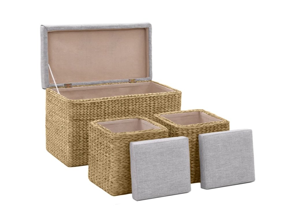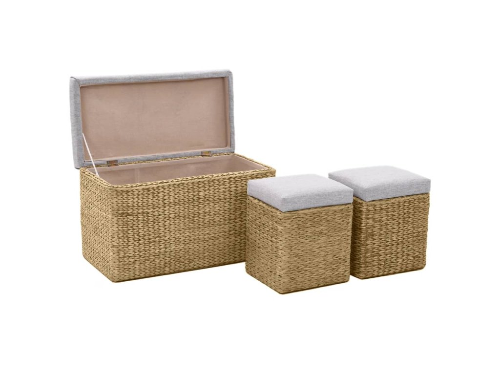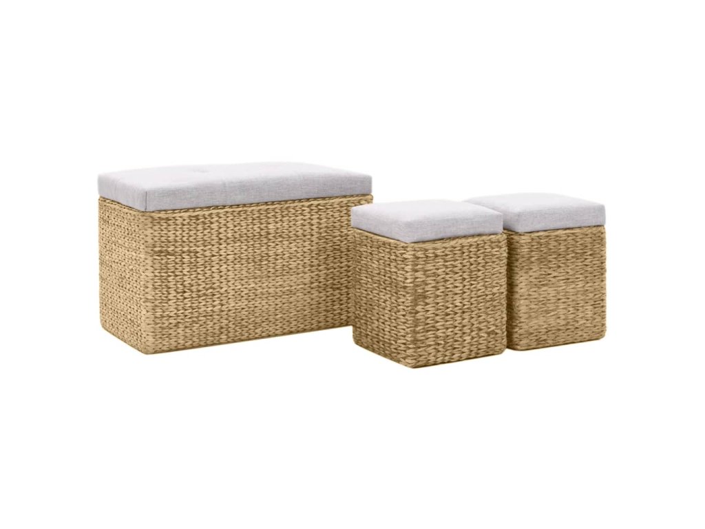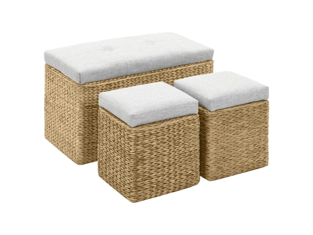 Lavice a taburety jsou vyrobeny z mořské trávy a dodají vašemu pokoji rustikální a přírodní kouzlo. Souprava poskytuje spoustu místa pro přehledné uchovávání různých předmětů, které chcete mít po ruce. Polstry vám umožní užít si při sezení ještě většího pohodlí. Souprava je již sestavena; další montáž není nutná.