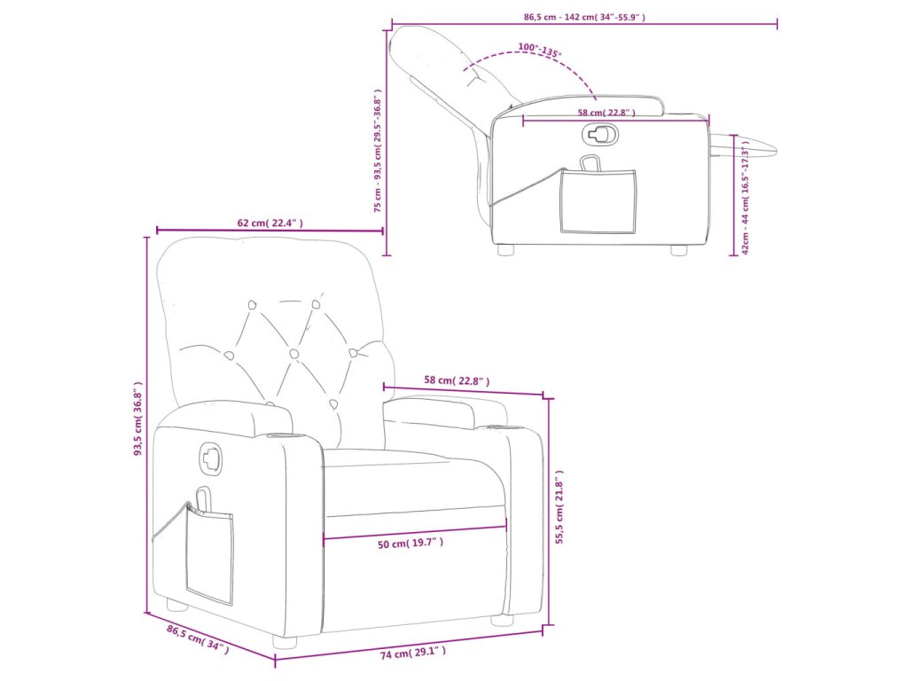 - Funkce ručního sklápění: Toto polohovací křeslo má na pravé straně páčku. Jednoduchým zatažením za páčku můžete ručně nastavit opěrku nohou a opěradlo do libovolné polohy podle svého pohodlí. Tato funkce umožňuje maximální náklon 135 stupňů. Opěradlo se navíc může snadným zatažením za páčku rychle vrátit do původní polohy.