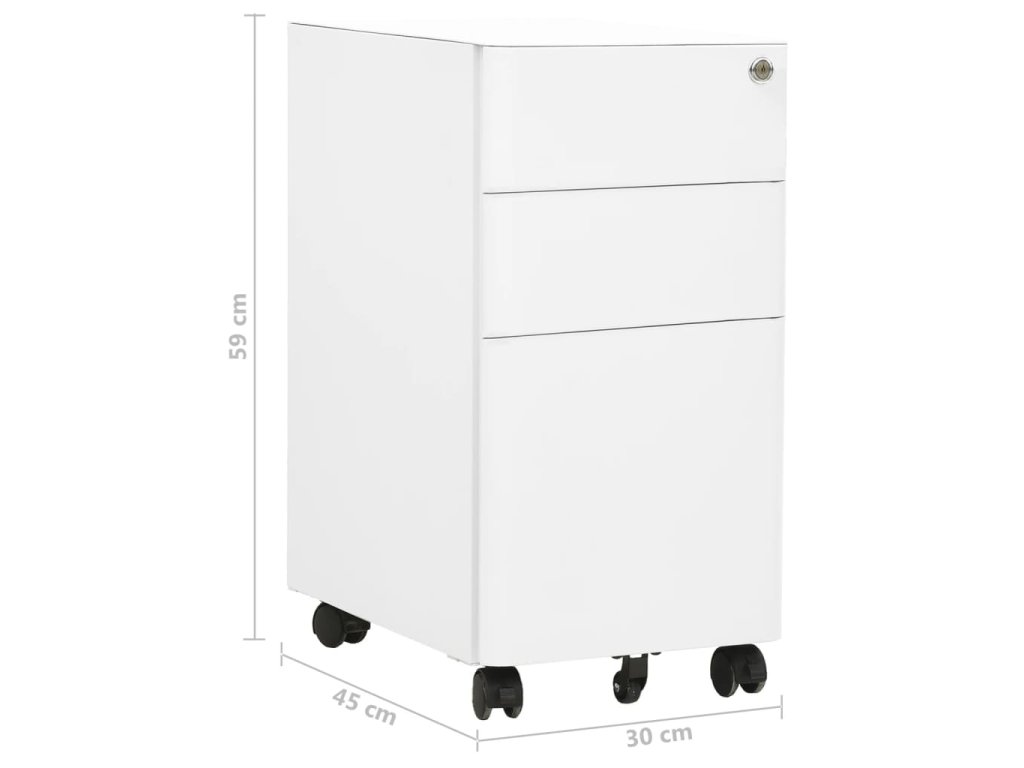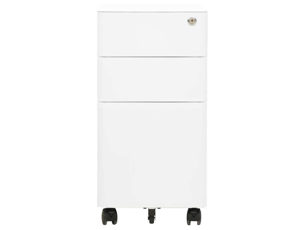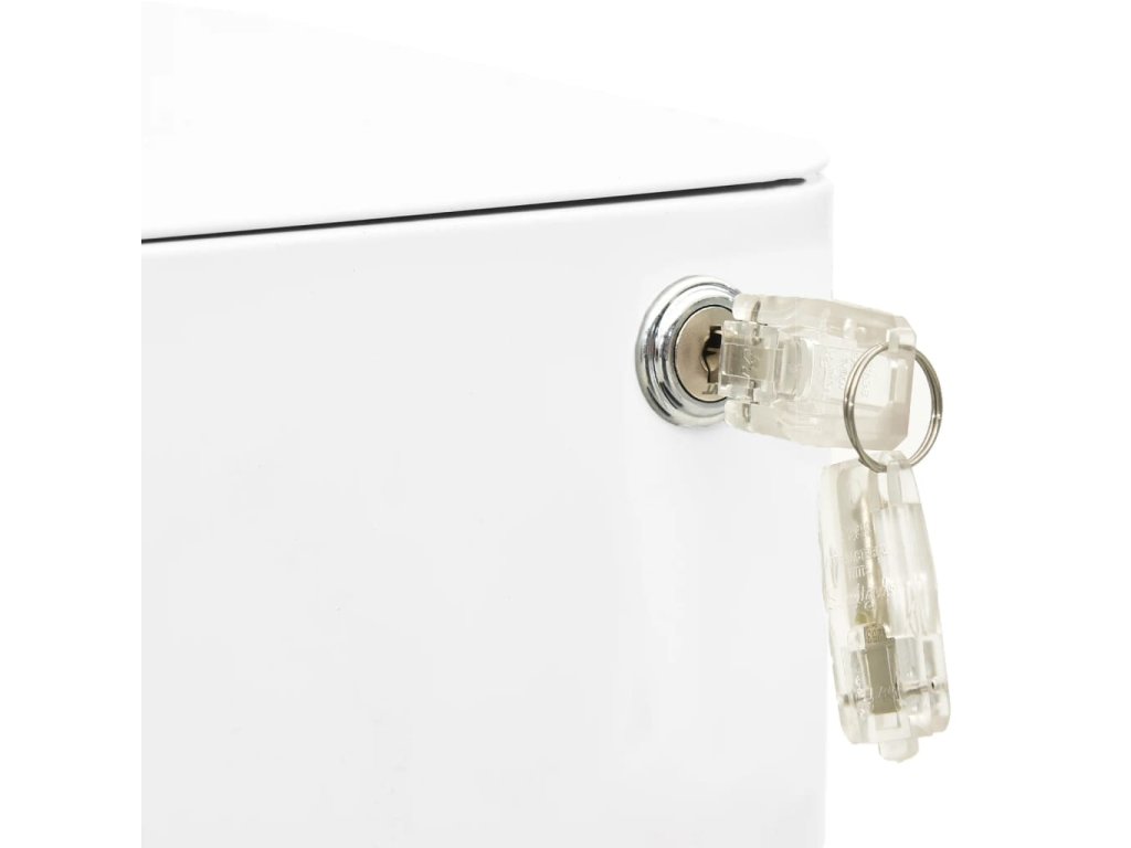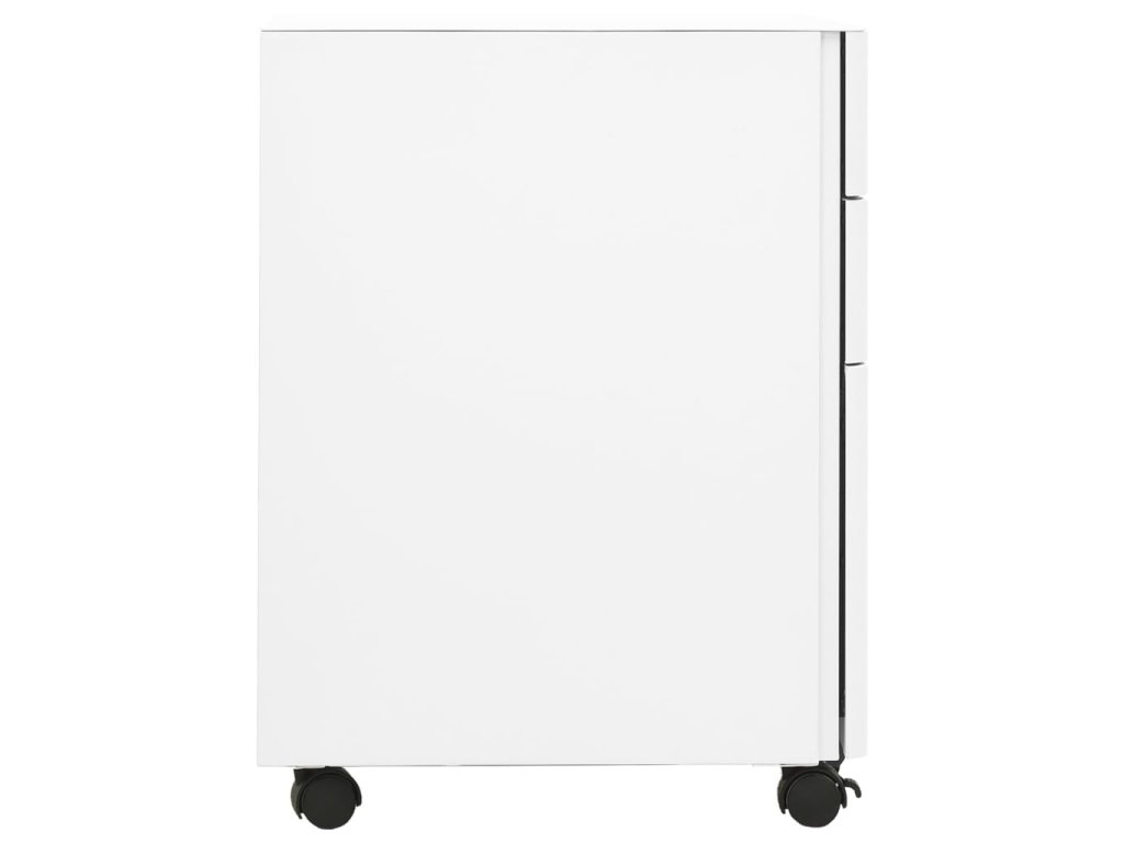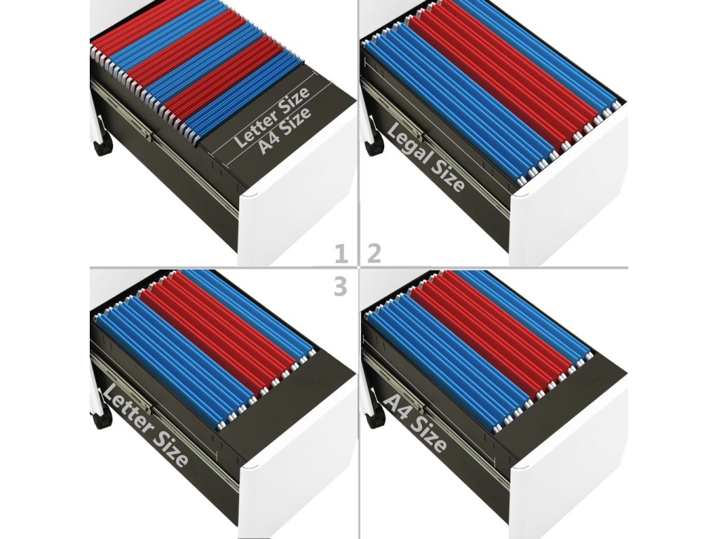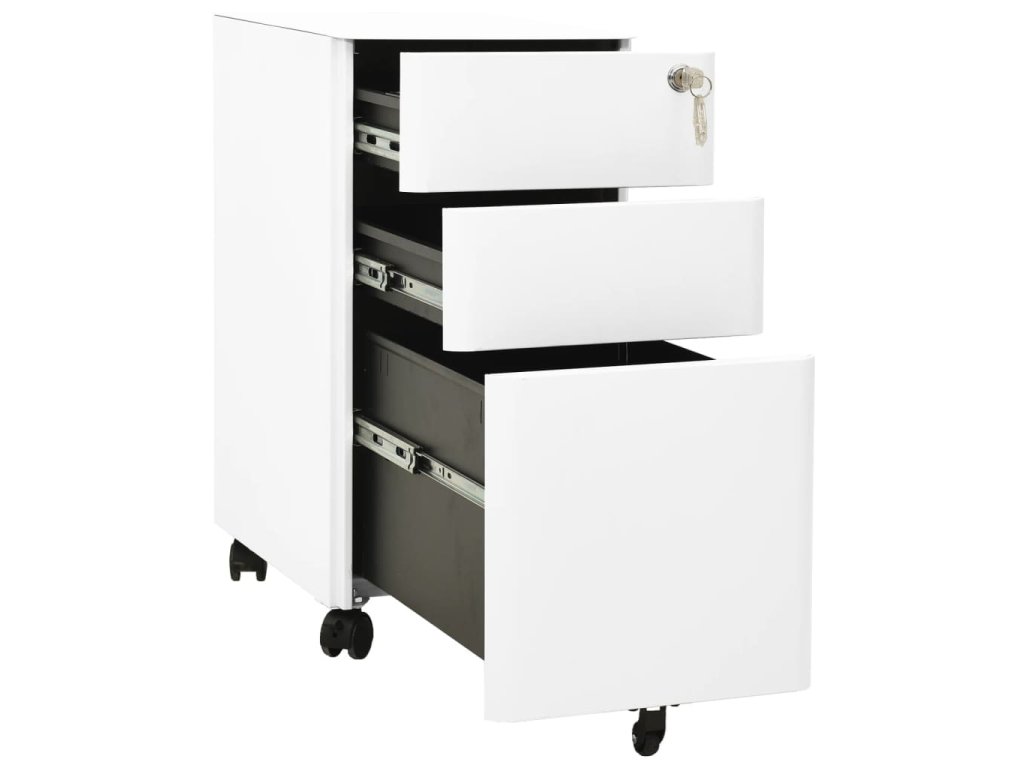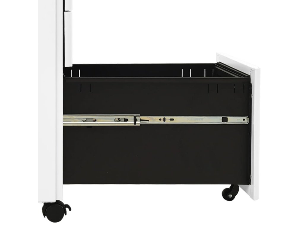 Tato kartotéka je vyrobena z oceli, je tedy odolná a snadno se čistí. Disponuje 3 zásuvkami a 1 zámkem, takže můžete přehledně třídit soubory do různých kategorií a mít je bezpečně uložené. Každá zásuvka je vybavena 1 odnímatelnou závěsnou tyčí, kterou lze libovolně kombinovat pro uložení souborů formátů letter, legal a závěsné desky velikosti A4. Pojízdná skříňka má zásobník na tužky, se kterým snadno udržíte na stole pořádek. Zásuvky s třídílnými pojezdy s kuličkovými ložisky zajišťují plynulé otevírání a zavírání, i při zvýšené zátěži se zásuvky dají zcela vysunout. Jak levý, tak pravý roh skříňky je zakulacený.