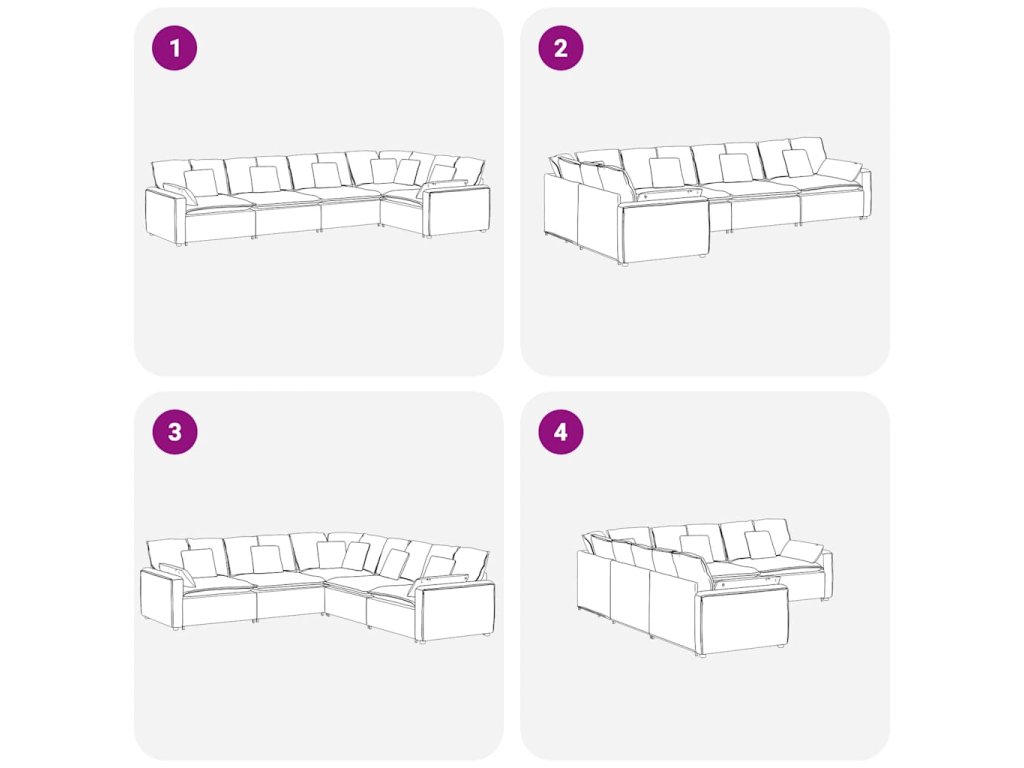 - Modulární konstrukce: Modulární konstrukce pohovky umožňuje snadnou změnu konfigurace tak, aby vyhovovala jakémukoli uspořádání místnosti. Tato flexibilní sestava zajišťuje všestranné řešení sezení, které se dokonale přizpůsobí vašemu prostoru a životnímu stylu.