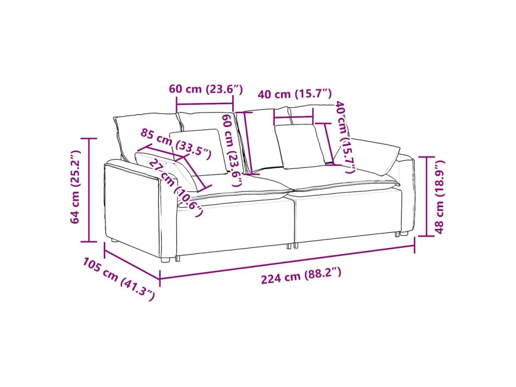 - Velkorysá místa k sezení: Pohovka je vybavena dvěma modulárními částmi a poskytuje dostatek místa k pohodlnému lenošení, takže je ideální pro rodinné sešlosti nebo zábavu s přáteli. Její prostorný design zajistí, že si všichni společně odpočinou, ať už ji použijete v útulném obývacím pokoji nebo v otevřeném prostoru.