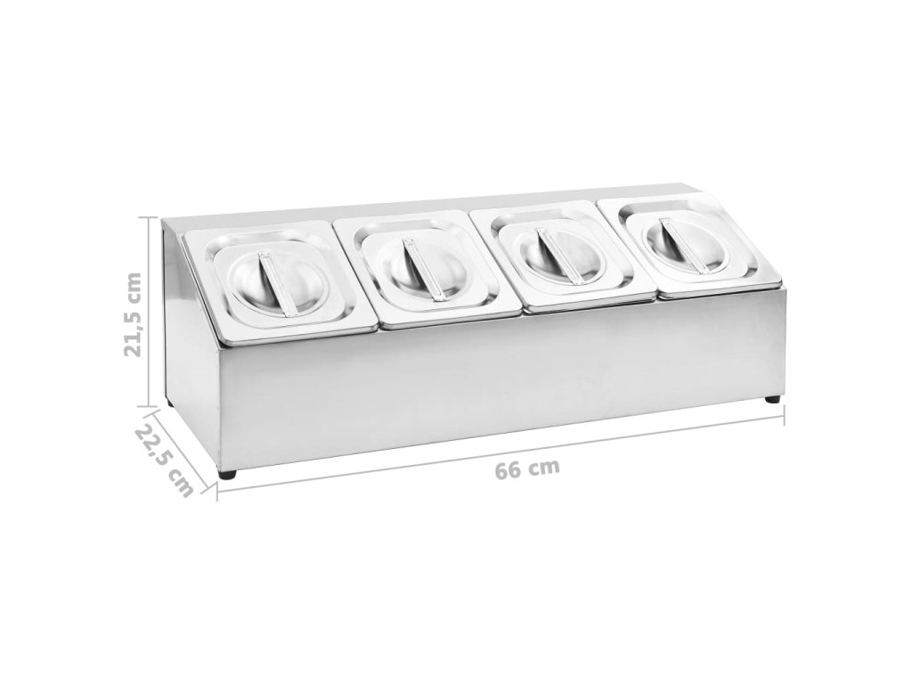 Tato nerez nástavba je vhodná do myčky a snadno se čistí. Protiskluzové gumové nožičky zaručují stabilitu nástavby a chrání pracovní povrch před poškrábáním. Salátový bar obsahuje 4 GN 1/6 nádoby, které lze vyjmout pro snadné plnění a vyprazdňování. Nástavbu dodáváme také s odpovídajícími víky, aby uložené potraviny zůstaly čerstvé, bezpečné a bez škůdců.