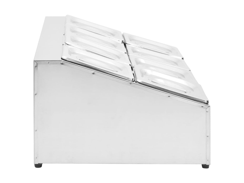 Tato nerez nástavba je vhodná do myčky a snadno se čistí. Protiskluzové gumové nožičky zaručují stabilitu nástavby a chrání pracovní povrch před poškrábáním. Salátový bar obsahuje 8 GN 1/6 nádob, které lze vyjmout pro snadné plnění a vyprazdňování. Nástavba je vybavená také odpovídajícími víky, aby uložené potraviny zůstaly čerstvé, bezpečné a bez škůdců.