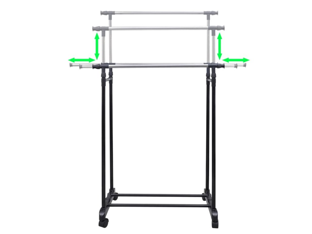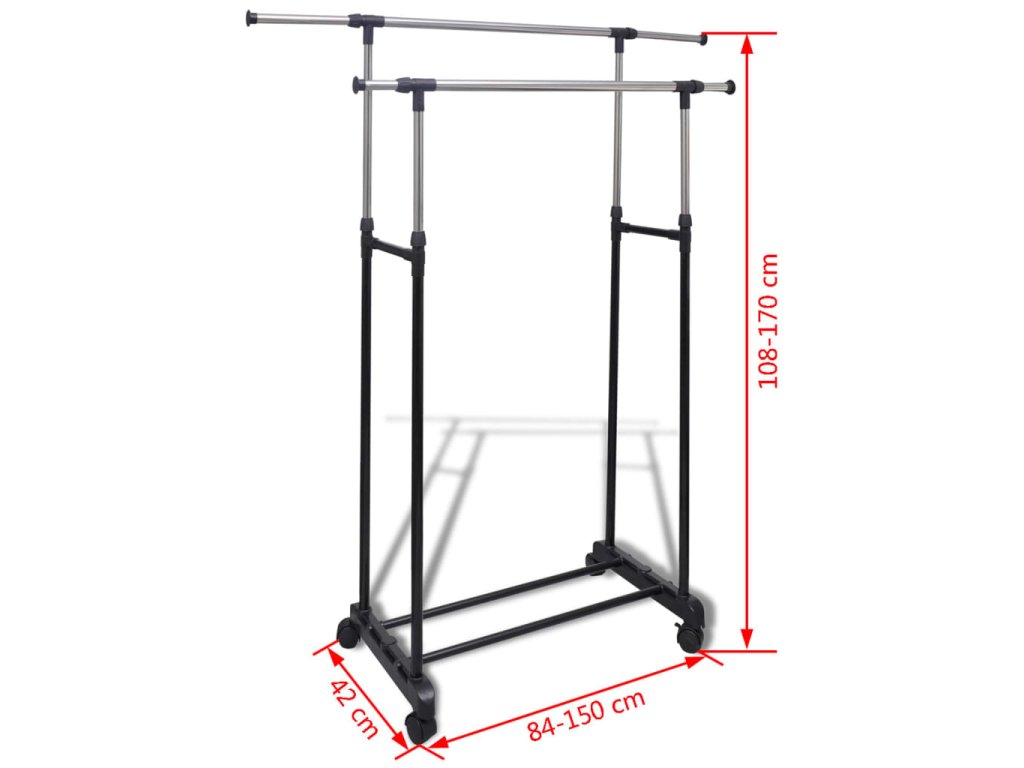 Dvě šatní tyče lze roztáhnout až na 150 cm, nabízí tudíž maximum prostoru k rozvěšení oblečení. Samotný stojan ale přitom zabírá jen minimálně místa. Nastavit lze též jeho výšku, a to od 108 cm do 170 cm.