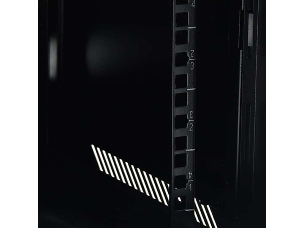 Tato datová skříň s pevnou konstrukcí je vyrobena z prvotřídní oceli válcované za studena, takže je pevná a velice dlouho vydrží. Je kompatibilní se standardním 19" vybavením. Odnímatelné boční panely usnadňují instalaci a údržbu síťového příslušenství. Součástí je také zámek a klíče. Uzamykatelná přední dvířka zabraňují nechtěnému otevření a udržují předměty v bezpečí. Rozvodnou skříň můžete připevnit na zeď nebo ji položit na stůl.