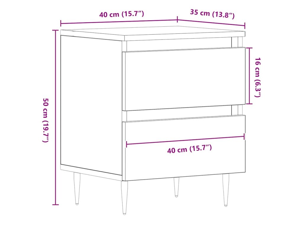 Tenhle moderní noční stolek přináší do vaší ložnice styl a funkčnost. S ideálními rozměry 40 x 35 x 50 cm je skvělý hned vedle postele – pohodlně se vejde lampa, budík nebo vaše věci. Elegantní minimalistický vzhled se hodí všude, navíc díky inženýrskému dřevu vydrží dlouho.