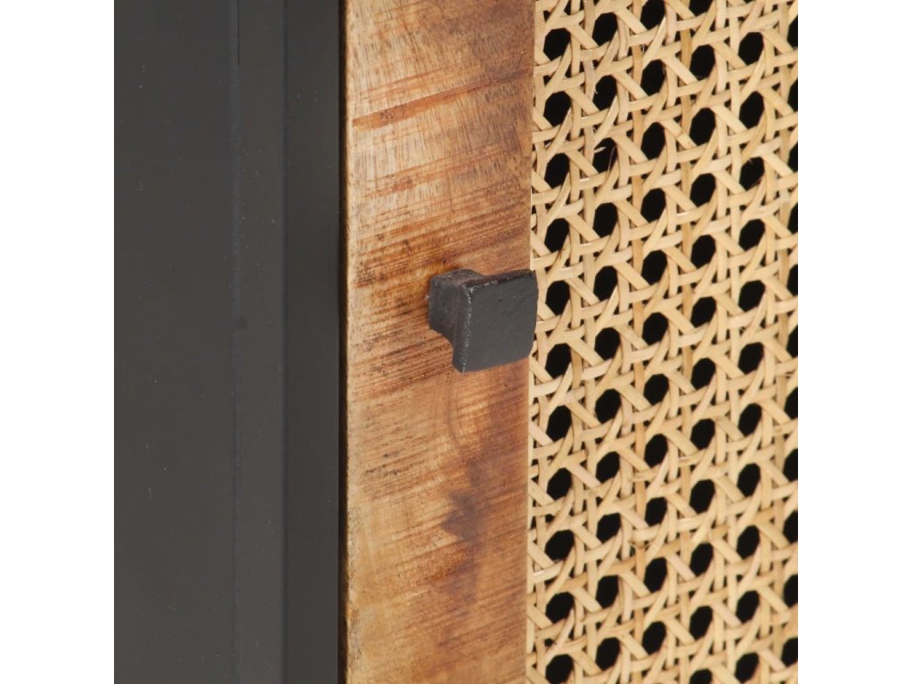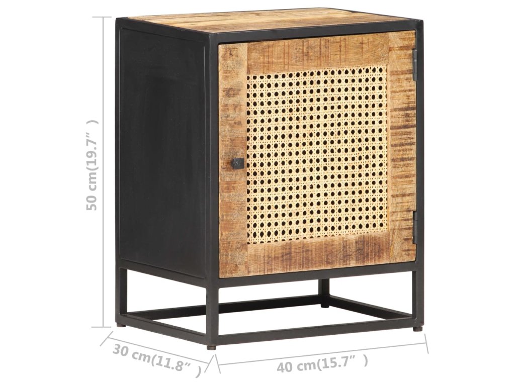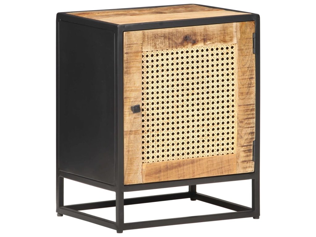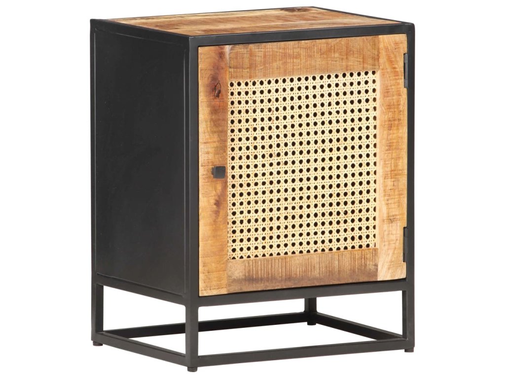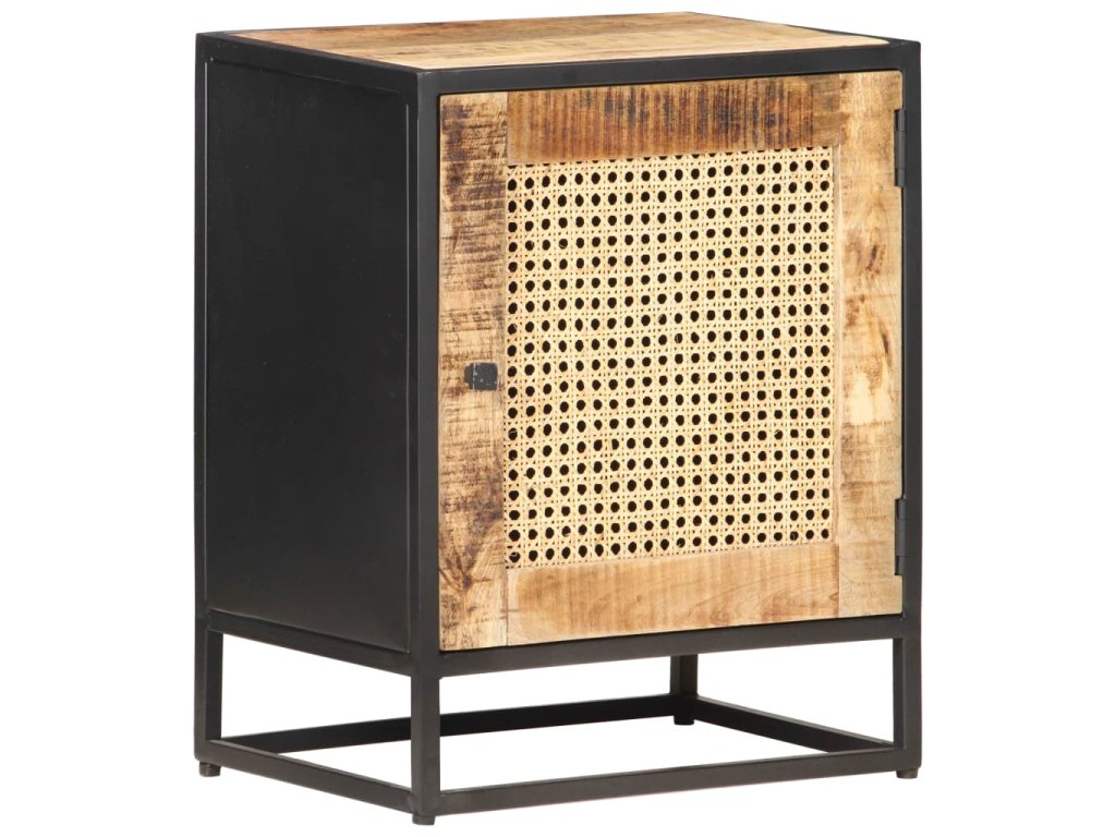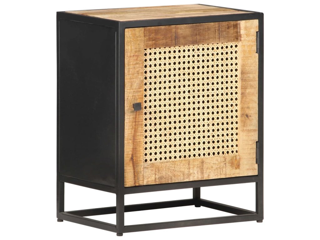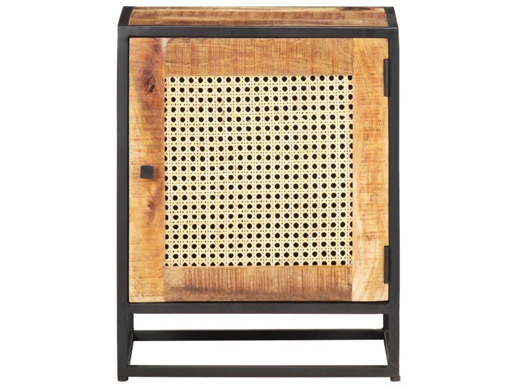 Masivní mangovník je tropické tvrdé dřevo, které jednak unese značnou váhu a jednak výborně odolává zubu času a neopotřebovává se. Precizní řemeslné zpracování a nádherná kresba dřeva dává každé noční skříňce odlišný charakter, takže nenajdete dvě zcela stejné. Noční stolek nabízí spoustu úložného místa, takže si do něj můžete přehledně uložit vše potřebné nebo si na něm vystavit různé dekorace. Železné nohy zajišťují stabilitu a odolnost skříňky. Odkládací skříňka má navíc na dvířkách dekorativní vzor z ručně vyplétaného rákosu, který ji propůjčuje rustikální šarm.