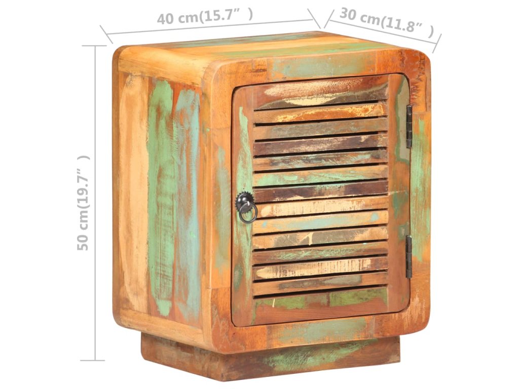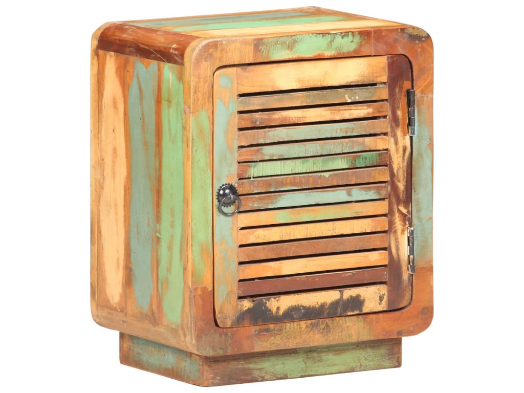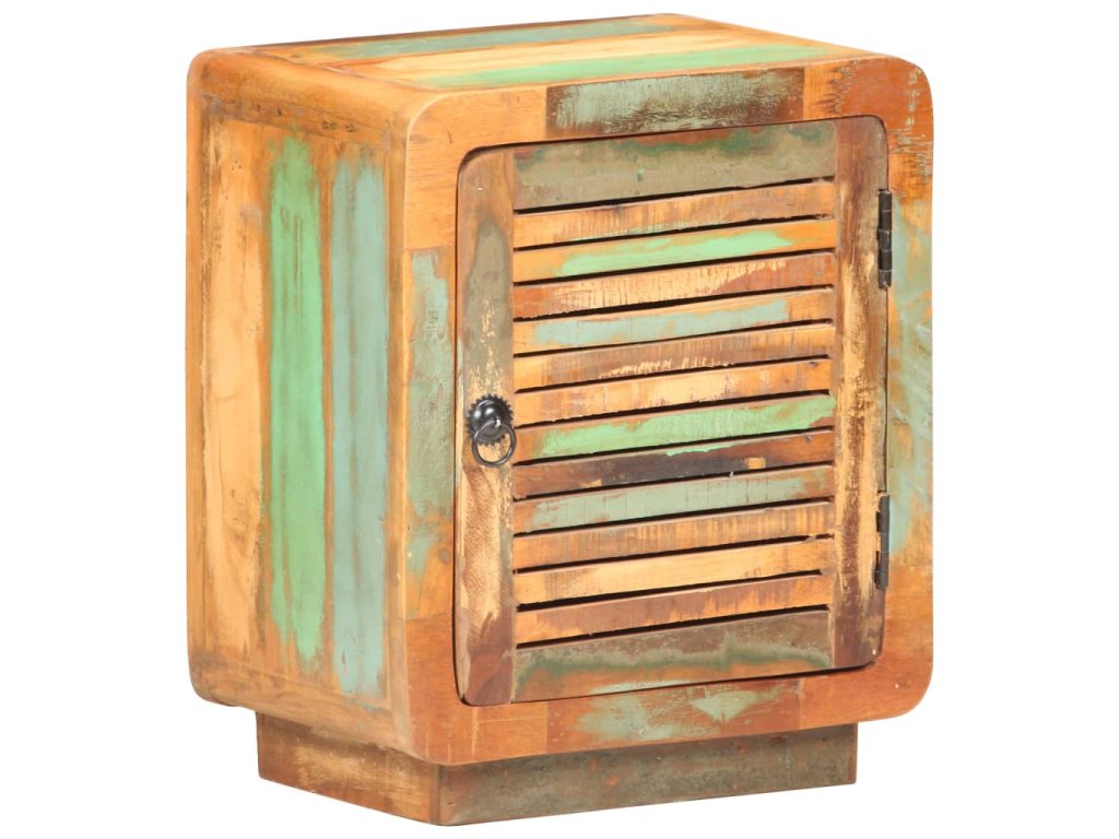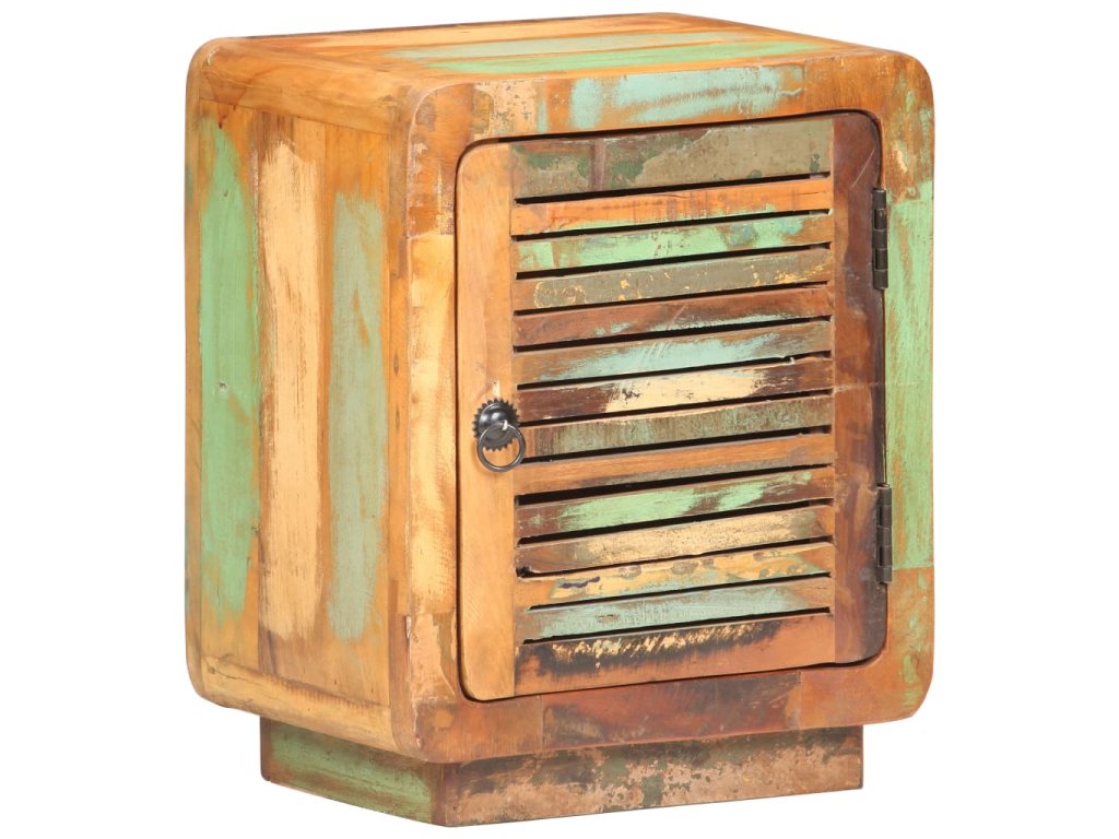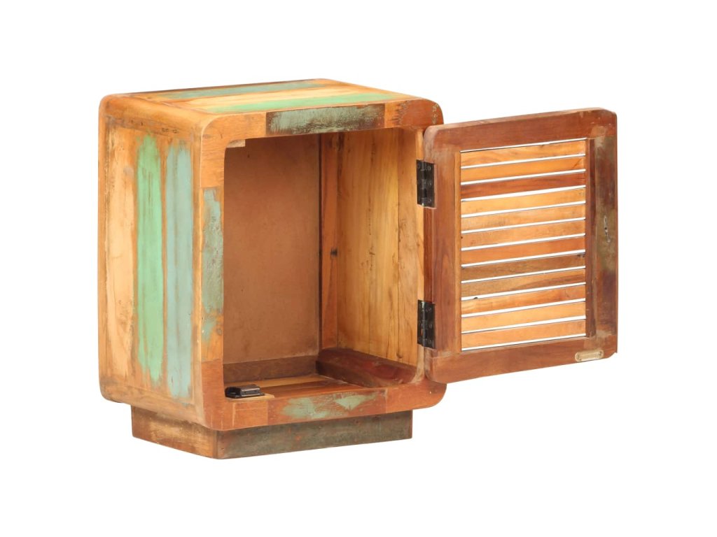 Noční stolek je vyrobený z masivního recyklovaného dřeva s vícebarevnou povrchovou úpravou. Recyklované dřevo pochází z trámů, podlah a podpěrných nosníků starých budov určených k demolici. Sestává tedy z různých druhů dřeva, jako jsou teak, tvrdé dřevo, tropické dřevo, mangovník apod. Recyklované dřevo tak nabývá vlastností všech těchto rozličných typů dřevin. Navíc je již zestárlé, ošlehané a vyschlé, takže se nesmršťuje ani neohýbá. Ve stolku je velká přihrádka s dvířky pro různé drobnosti. Robustní horní deska je perfektní místo pro různé dekorace. V bydlení tato skříňka může také sloužit jako úložná skříňka, odkládací stolek apod.