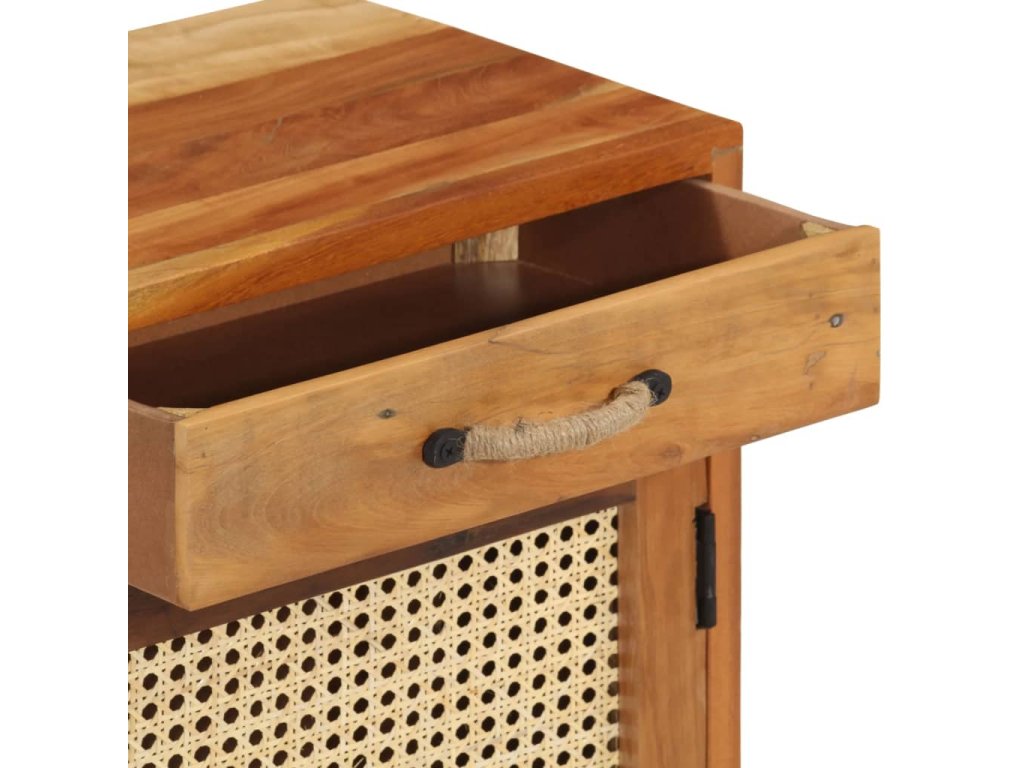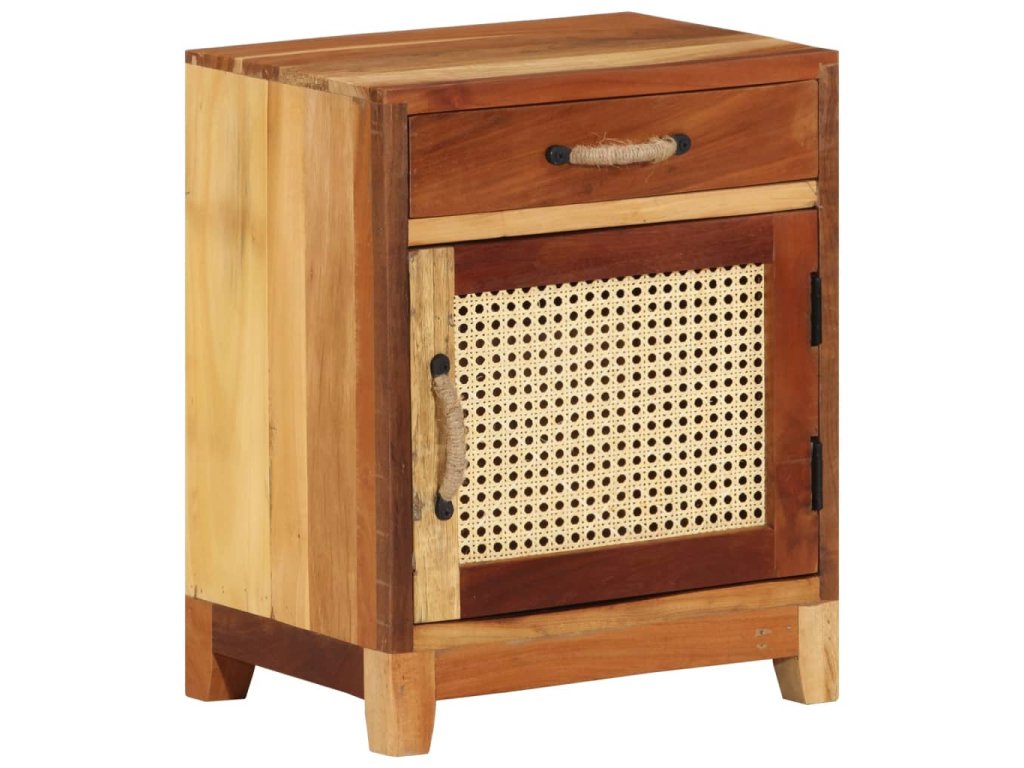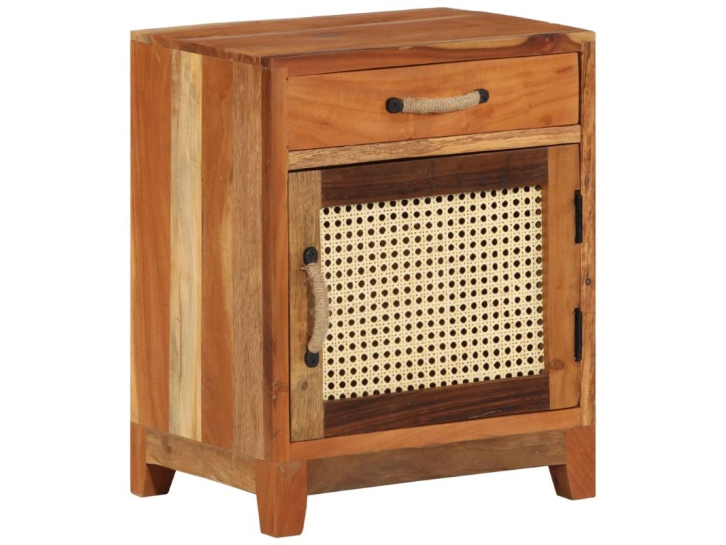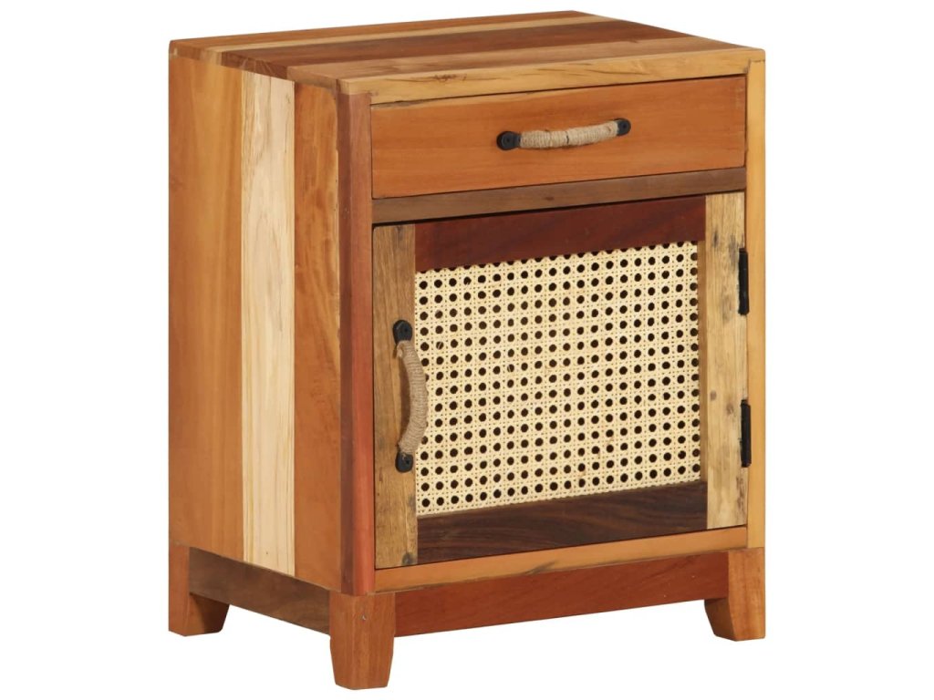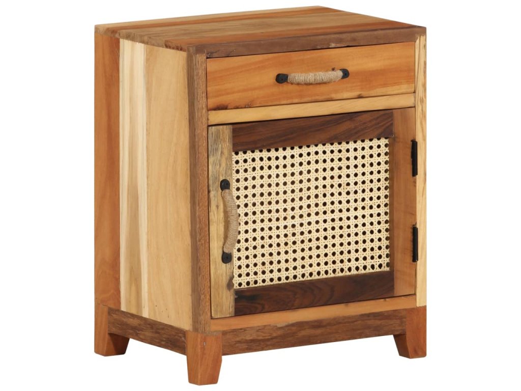 Noční stolek je vyrobený z masivního recyklovaného dřeva, které pochází z trámů, podlah a podpěrných nosníků starých budov určených k demolici. Sestává tedy z různých druhů dřeva, jako je teak, tvrdé dřevo, tropické dřevo, mangovník apod. Recyklované dřevo tak nabývá vlastností všech těchto rozličných typů dřevin. Navíc je již zestárlé, ošlehané a vyschlé. Takže se nesmršťuje ani neohýbá. Přední dvířka jsou vyrobena z přírodního rákosu. Noční stolek je celý ručně vyrobený a elegantní kresba dřeva navíc každému kusu propůjčuje jedinečný a od všech ostatních lehce odlišný vzhled. Každá fáze výrobního procesu se provádí s největší péčí, ať už se jedná o leštění, natírání nebo lakování. Tato úložná skříňka poskytuje prostor pro uložení vašich knih, poznámkových bloků, psacích potřeb a dalších drobností. Sestavení tohoto nočního stolku je také snadné.