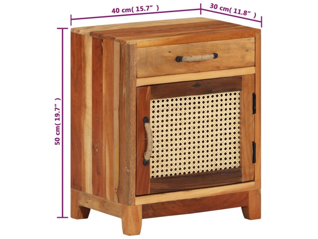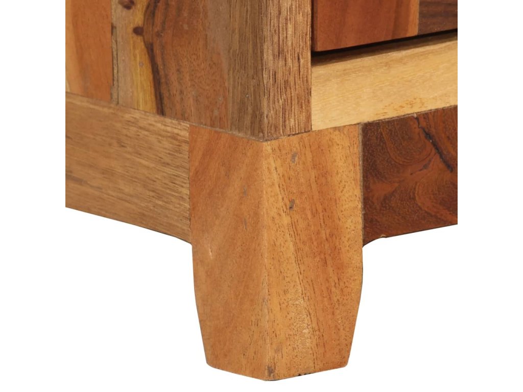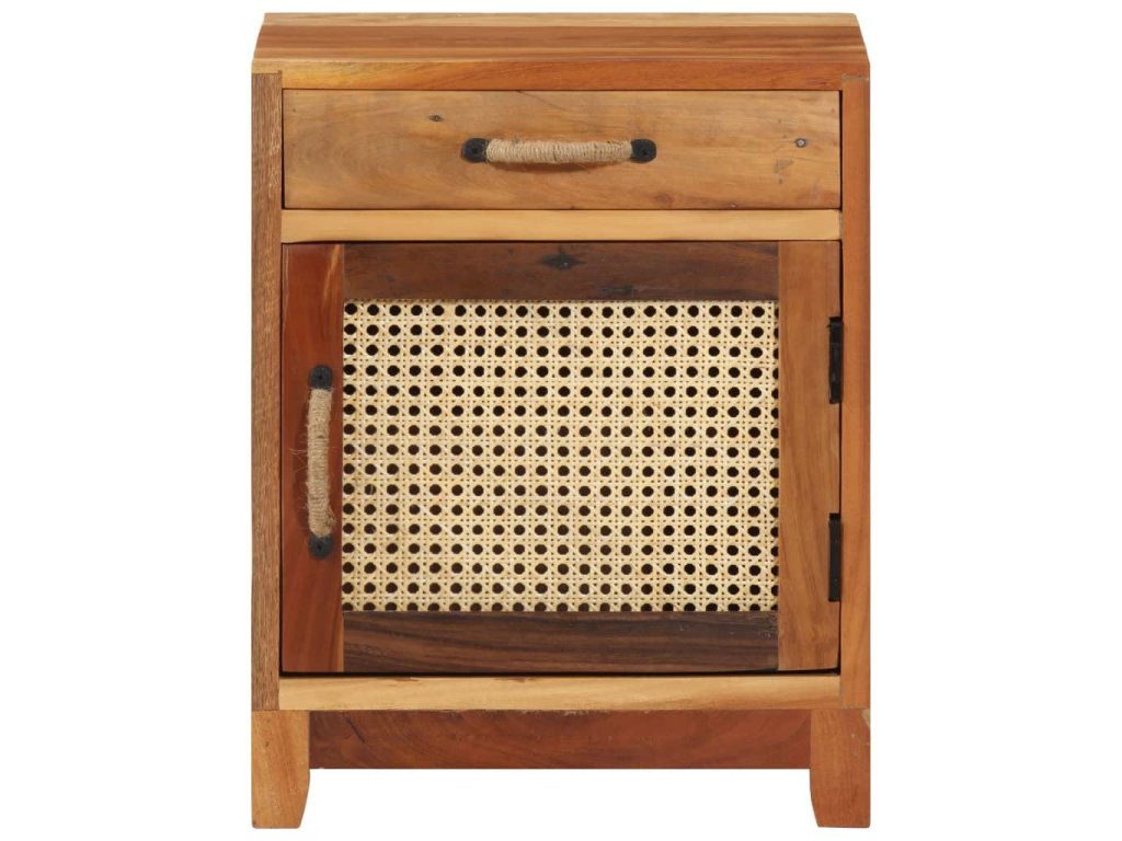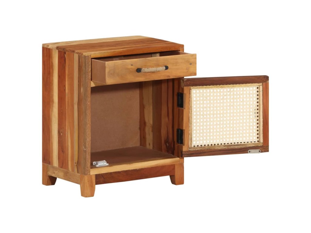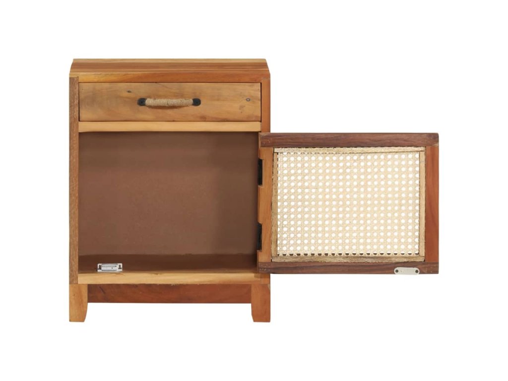 Noční stolek je vyrobený z masivního recyklovaného dřeva, které pochází z trámů, podlah a podpěrných nosníků starých budov určených k demolici. Sestává tedy z různých druhů dřeva, jako je teak, tvrdé dřevo, tropické dřevo, mangovník apod. Recyklované dřevo tak nabývá vlastností všech těchto rozličných typů dřevin. Navíc je již zestárlé, ošlehané a vyschlé. Takže se nesmršťuje ani neohýbá. Přední dvířka jsou vyrobena z přírodního rákosu. Noční stolek je celý ručně vyrobený a elegantní kresba dřeva navíc každému kusu propůjčuje jedinečný a od všech ostatních lehce odlišný vzhled. Každá fáze výrobního procesu se provádí s největší péčí, ať už se jedná o leštění, natírání nebo lakování. Tato úložná skříňka poskytuje prostor pro uložení vašich knih, poznámkových bloků, psacích potřeb a dalších drobností. Sestavení tohoto nočního stolku je také snadné.
