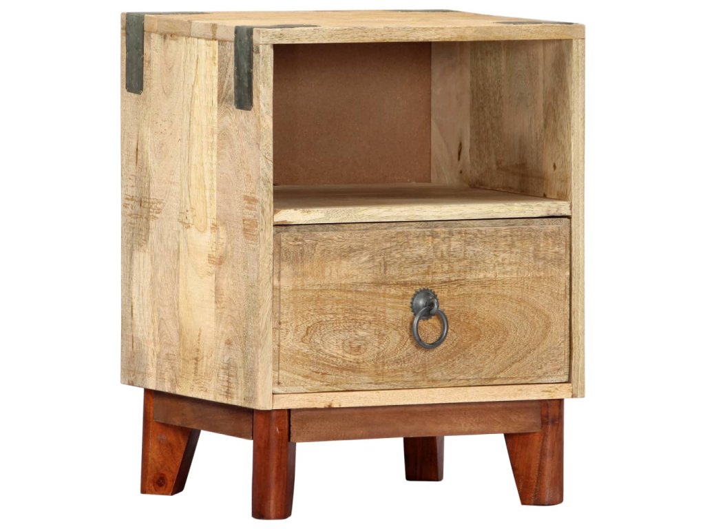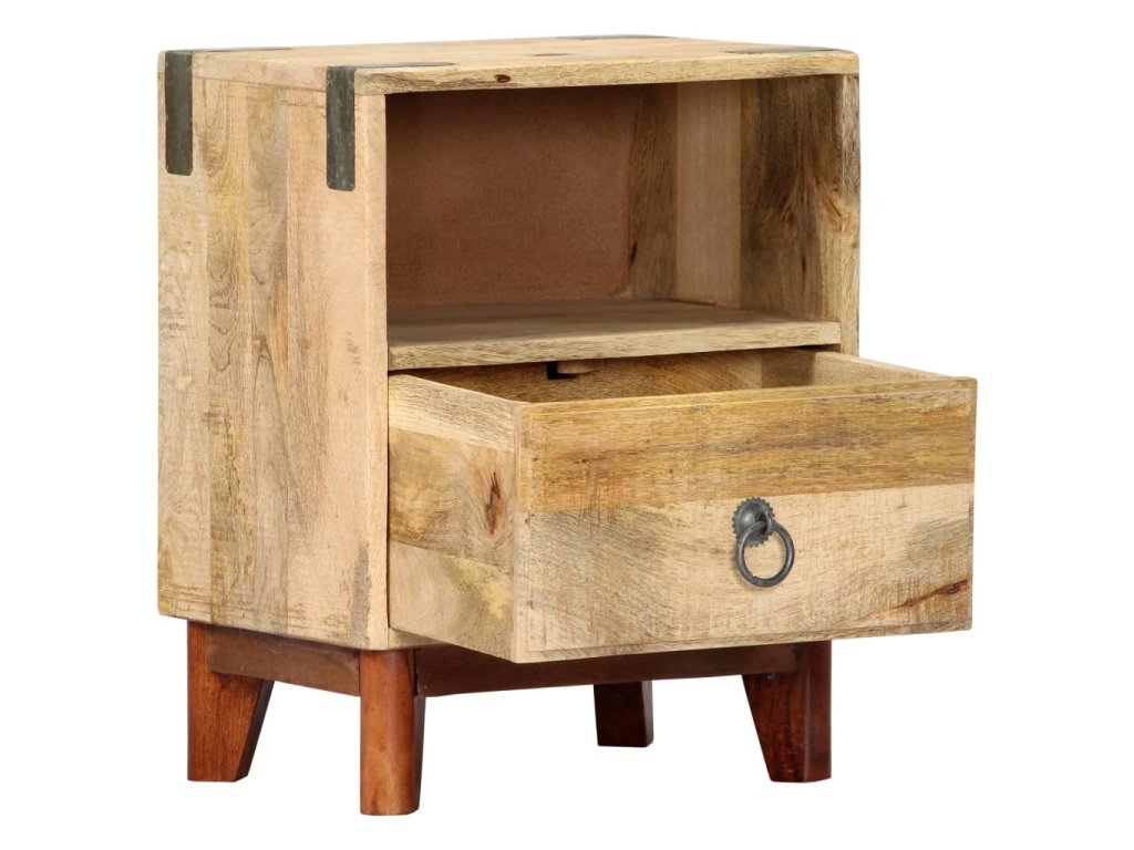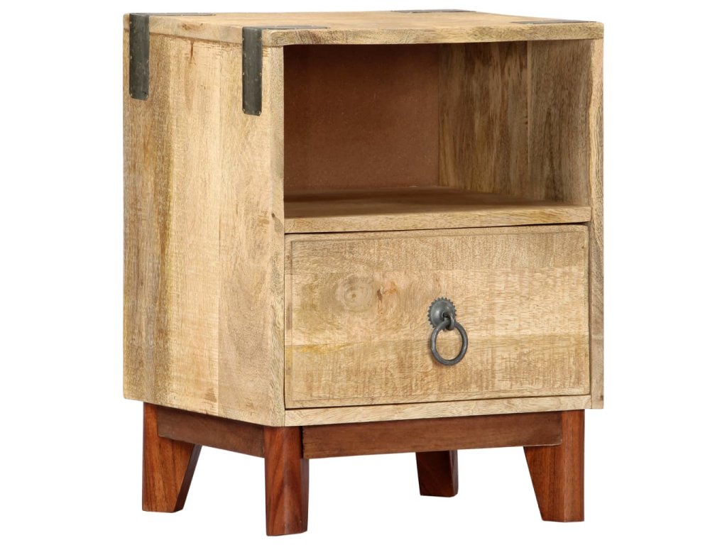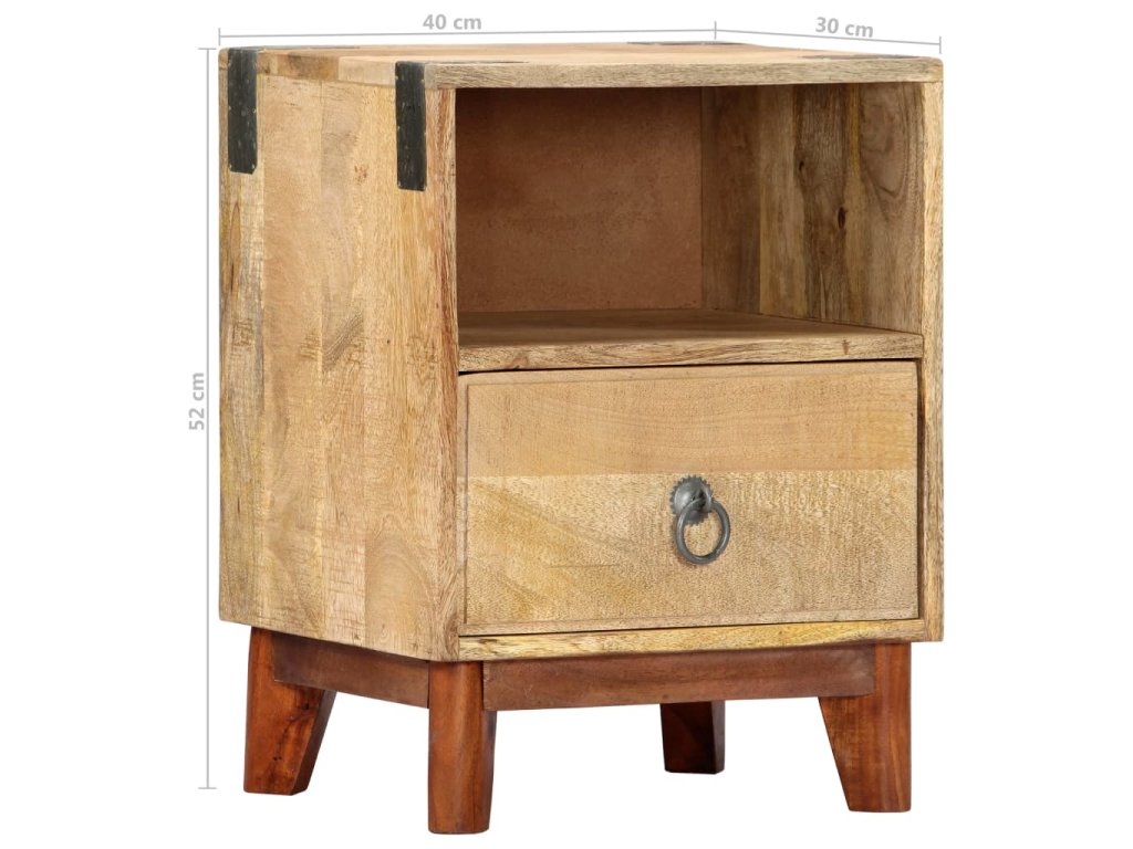 Noční stolek je vyroben z masivního hrubého mangovníkového dřeva, je tedy mimořádně stabilní a odolný. Mangovník má husté a robustní tvrdé dřevo, jehož povrch se vyznačuje překrásnými hnědými či zlatavými pruhy a liniemi. Na pevné desce stolku si můžete vystavit dekorativní předměty, jako jsou vázy a květináče. Ve skříňce najdete spoustu místa, kde si můžete úhledně uspořádat všelijaké věci. Její sestavení je jednoduché.