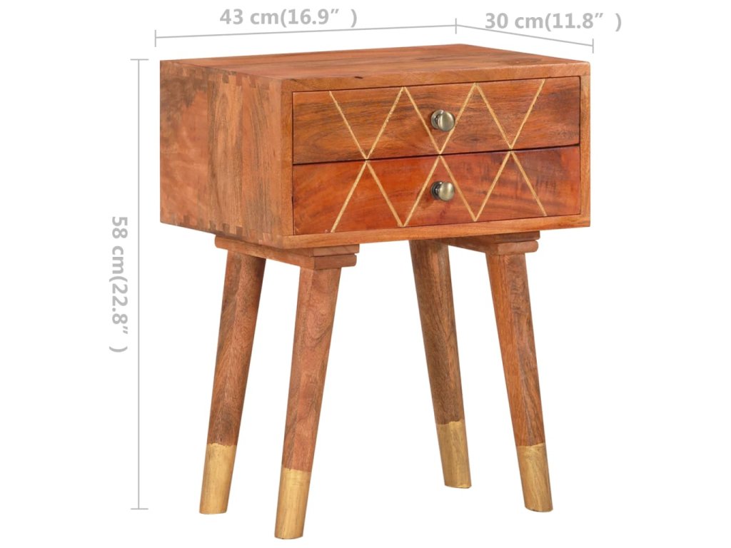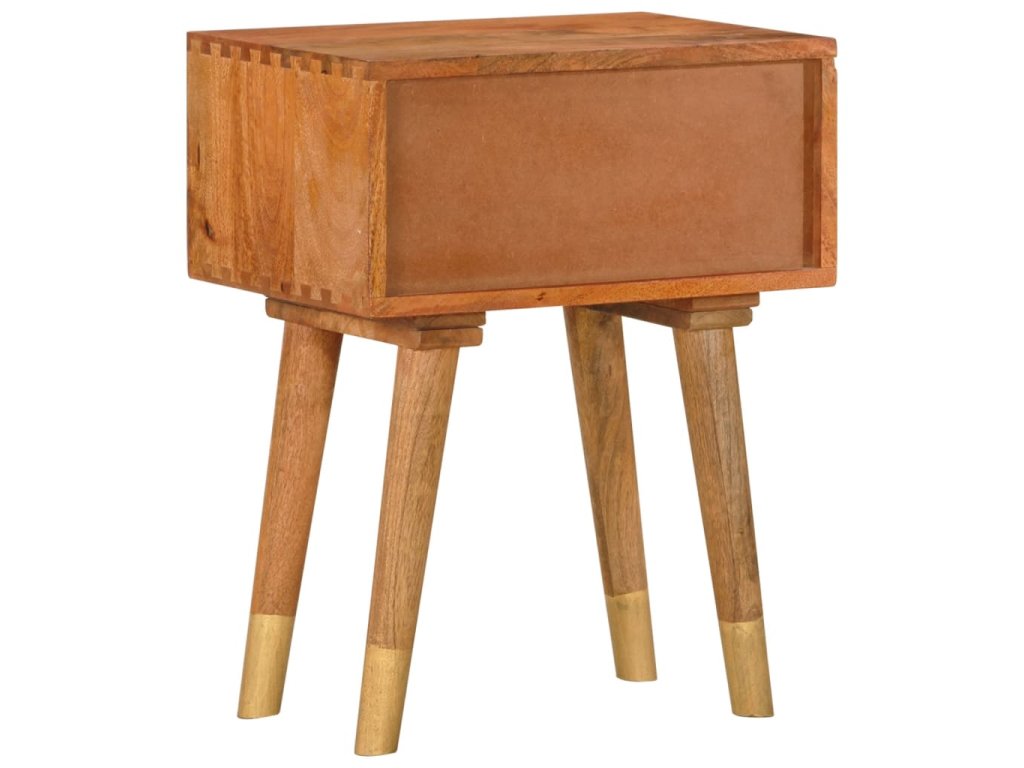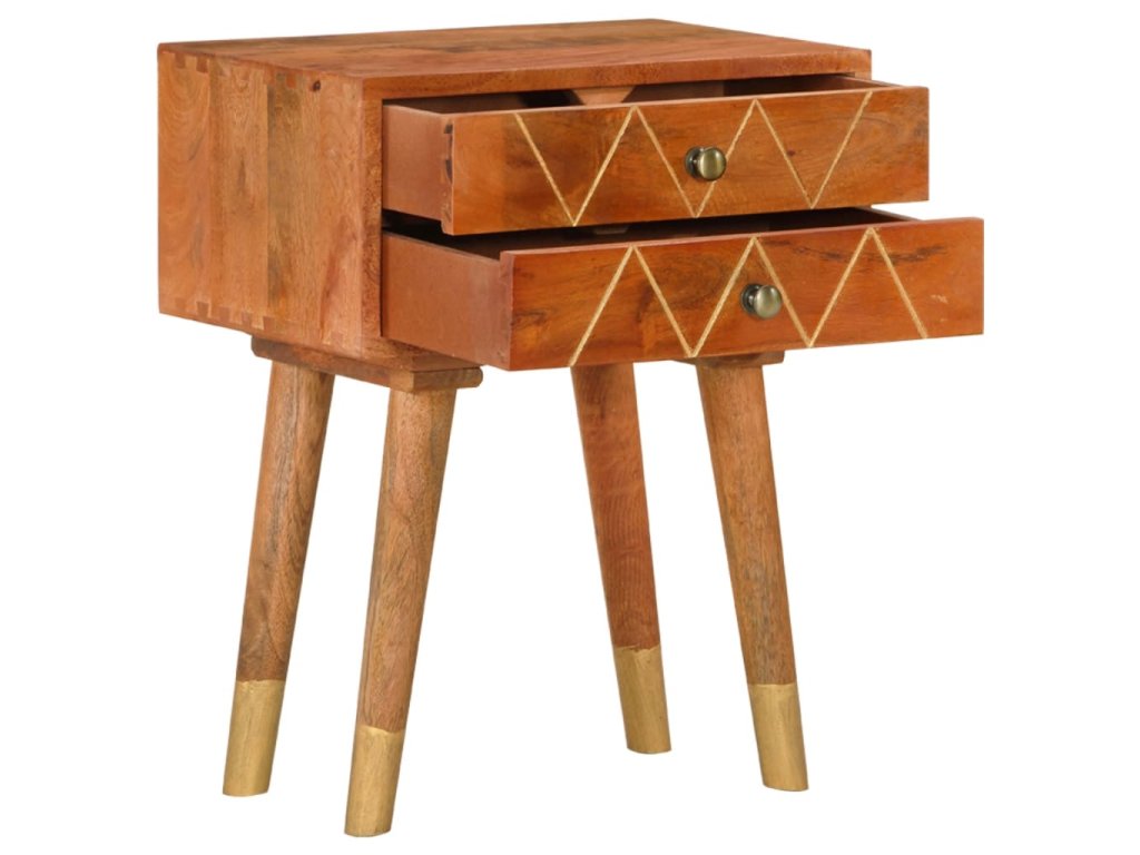 Noční stolek je vyrobený z masivního mangovníkového dřeva, které bylo naleštěné a nalakované, aby vynikl jeho půvabný a rafinovaný vzhled. Mangovník má odolné a robustní tvrdé dřevo s hnědými či zlatými pruhy a liniemi na povrchu. Ve stolku jsou pak 2 zásuvky, do kterých si můžete uspořádat drobnější předměty, abyste je měli neustále po ruce.