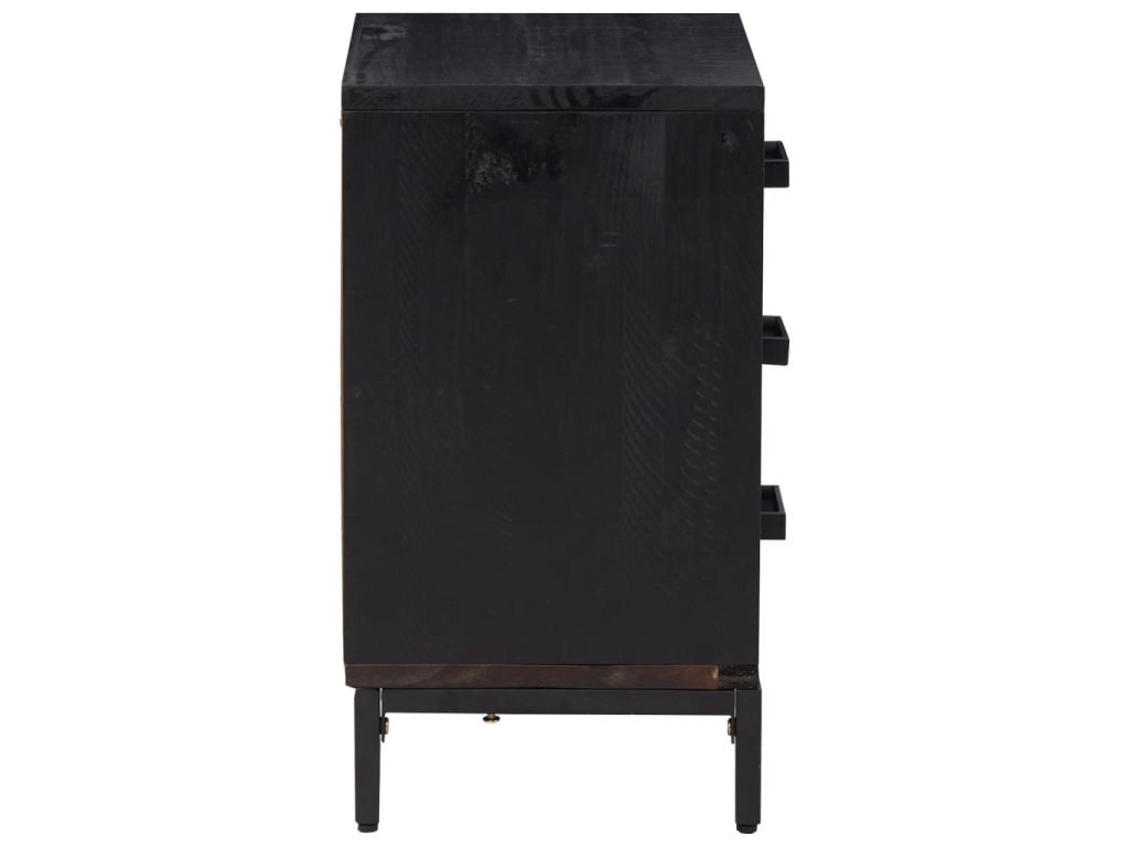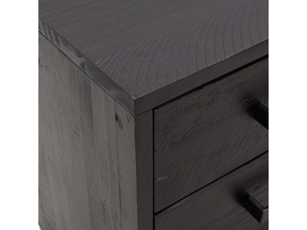 - Masivní borové dřevo: Skříňka je zhotovena z masivního borového dřeva, které vykazuje hrubé hrany, vady a škrábance, což jí dodává vintage industriální vzhled.