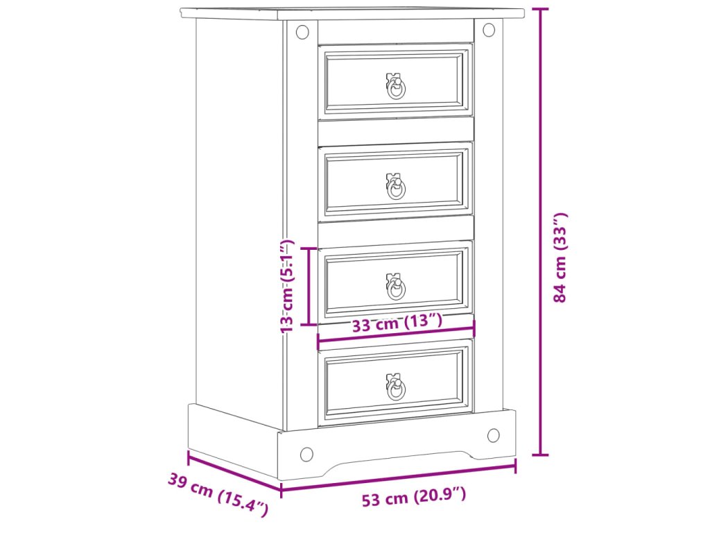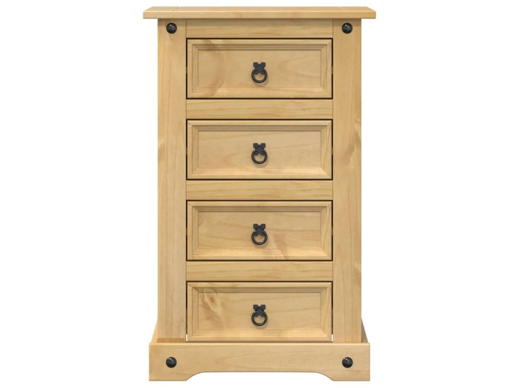 - Kovové úchytky: Skříňka je vybavena kovovými kroužkovými úchytkami, které usnadňují otevírání a zavírání zásuvek a zároveň jim dodávají na kráse.