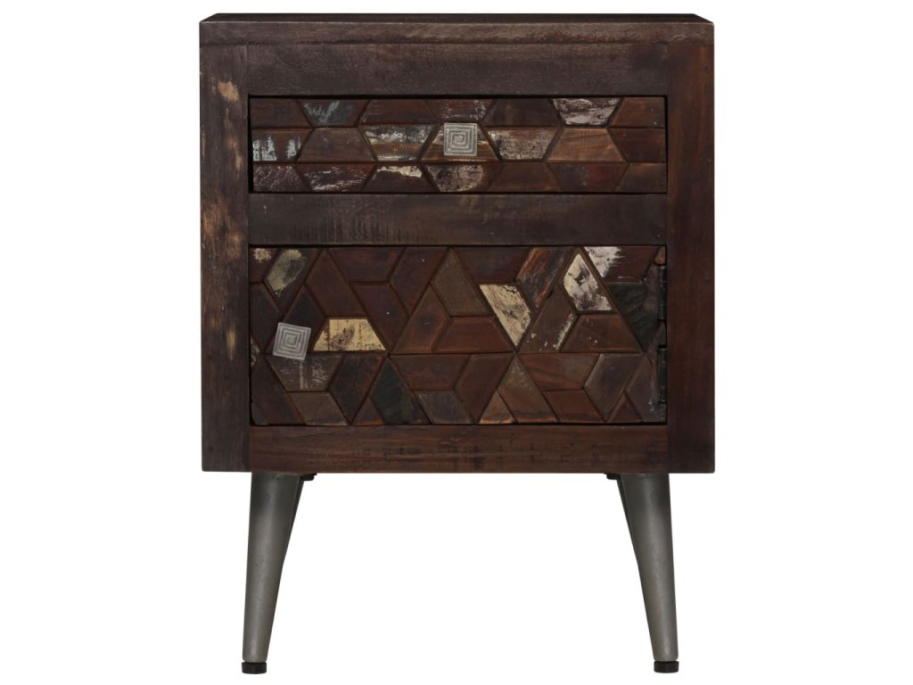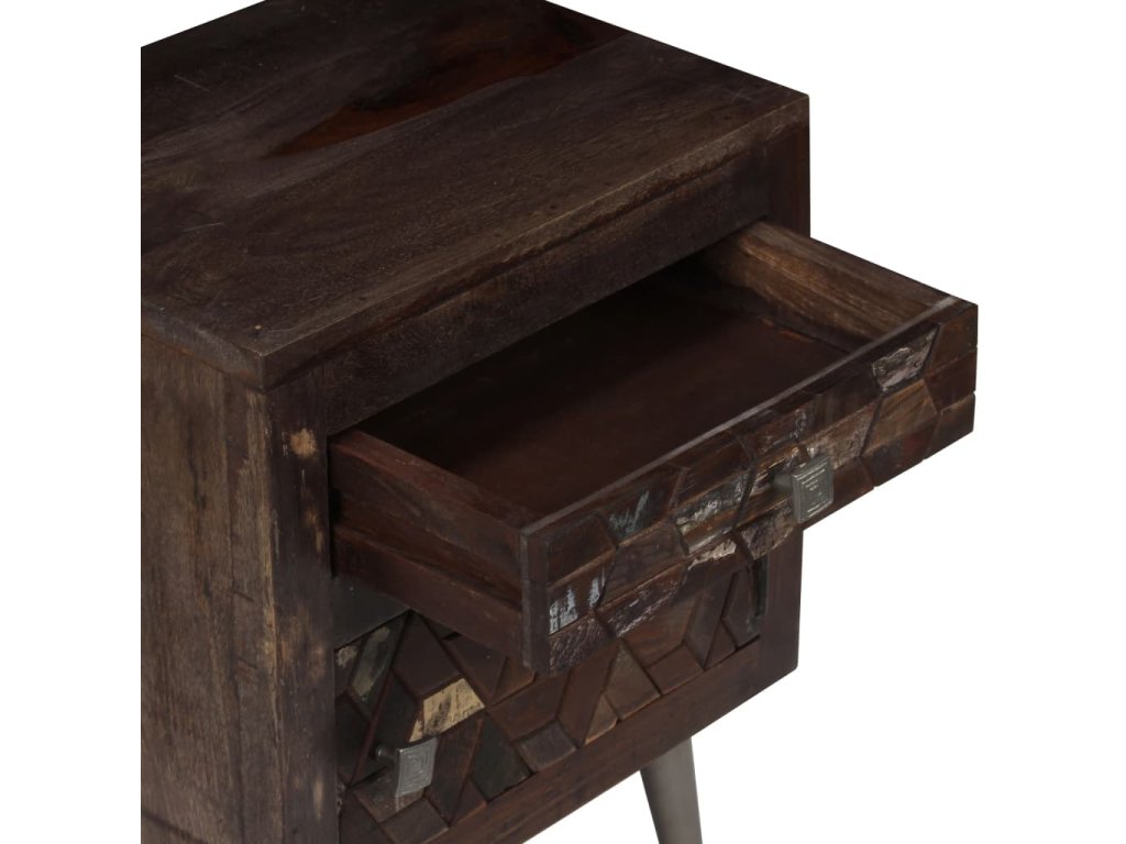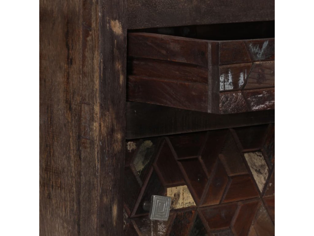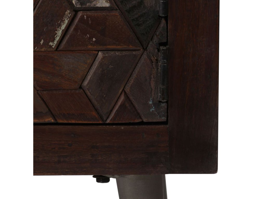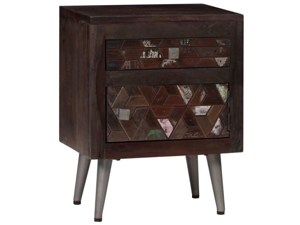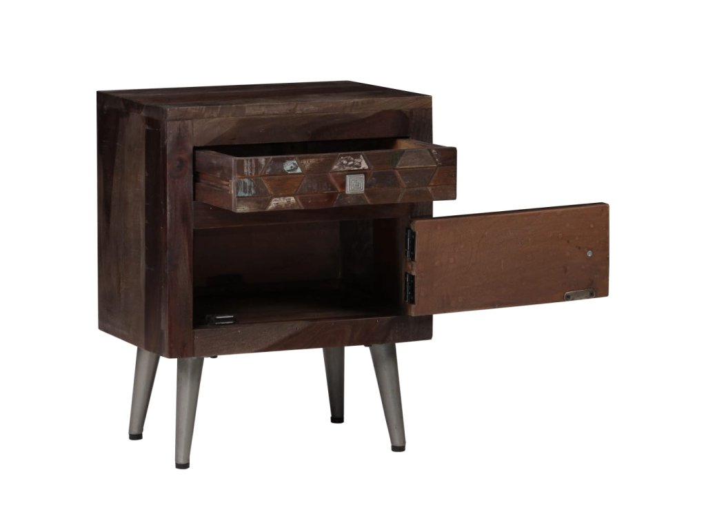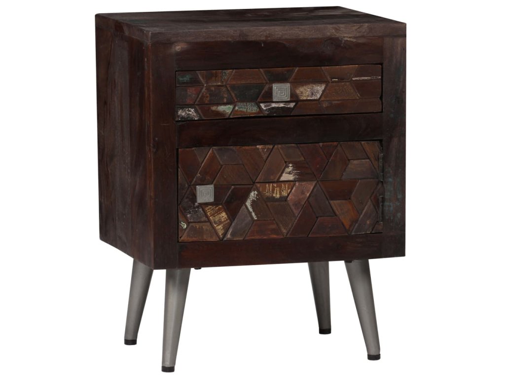Stolek je zhotovený z masivního recyklovaného dřeva, které pochází z trámů, podlah a podpěrných nosníků ze starých budov určených k demolici. Může tedy obsahovat celou řadu různých typů dřeva, jako je borovice, teak, buk, dub, cedr, mangovník, akácie atd. Recyklované dřevo tak nabývá vlastností všech těchto rozličných druhů dřeva. Recyklované dřevo je již zestárlé, ošlehané a vyschlé, takže se nesmršťuje ani neohýbá. Překrásná kresba dřeva činí každý kus nábytku jedinečným a lehce odlišným od ostatních. Známky opotřebení a zřetelná textura dřeva vypovídají o jeho bohaté historii a dodávají příborníku hřejivý a autentický vzhled. Každá fáze výrobního procesu je prováděna s největší pečlivostí, ať už se jedná o leštění, natírání anebo lakování. Noční stolek disponuje spoustou úložného prostoru, v němž můžete uchovávat menší předměty tak, aby byly přehledně uspořádané a po ruce. Na horní desku si můžete položit budík nebo sklenici vody, ale také dekorativní předměty, jako jsou zarámované fotografie. Ocelové nohy přispívají k bytelnosti stolku a přitom zvýrazňují jeho industriální styl. Montáž je snadná.