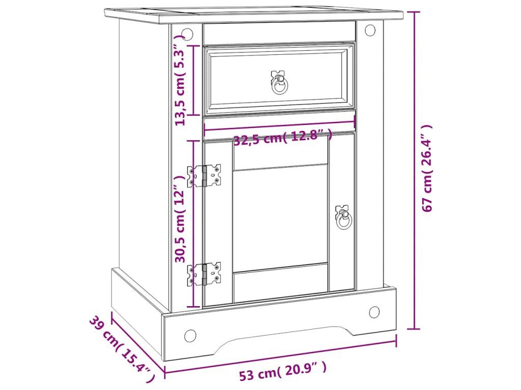 Tato vysoce kvalitní dřevěná TV skříňka je vyrobená v mexickém stylu Corona. Voskované borové dřevo a prvky z černého kovu propůjčují nočnímu stolku mexický šarm, který dokonale zkompletuje zařízení vaší ložnice, pokoje pro hosty nebo studentského pokoje. Produkt můžete také použít jako odkládací skříňku, přístavný stolek apod.