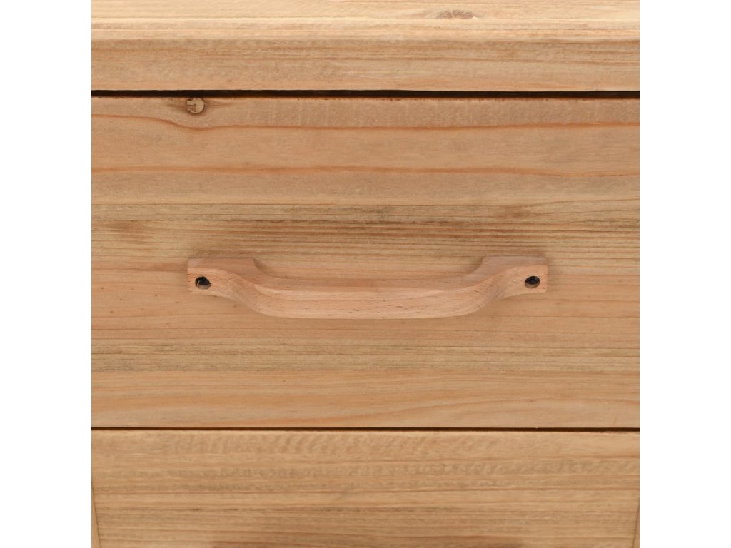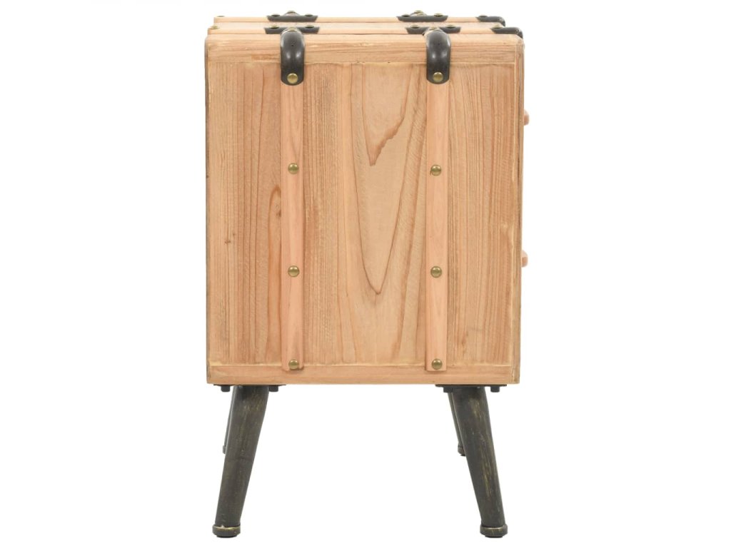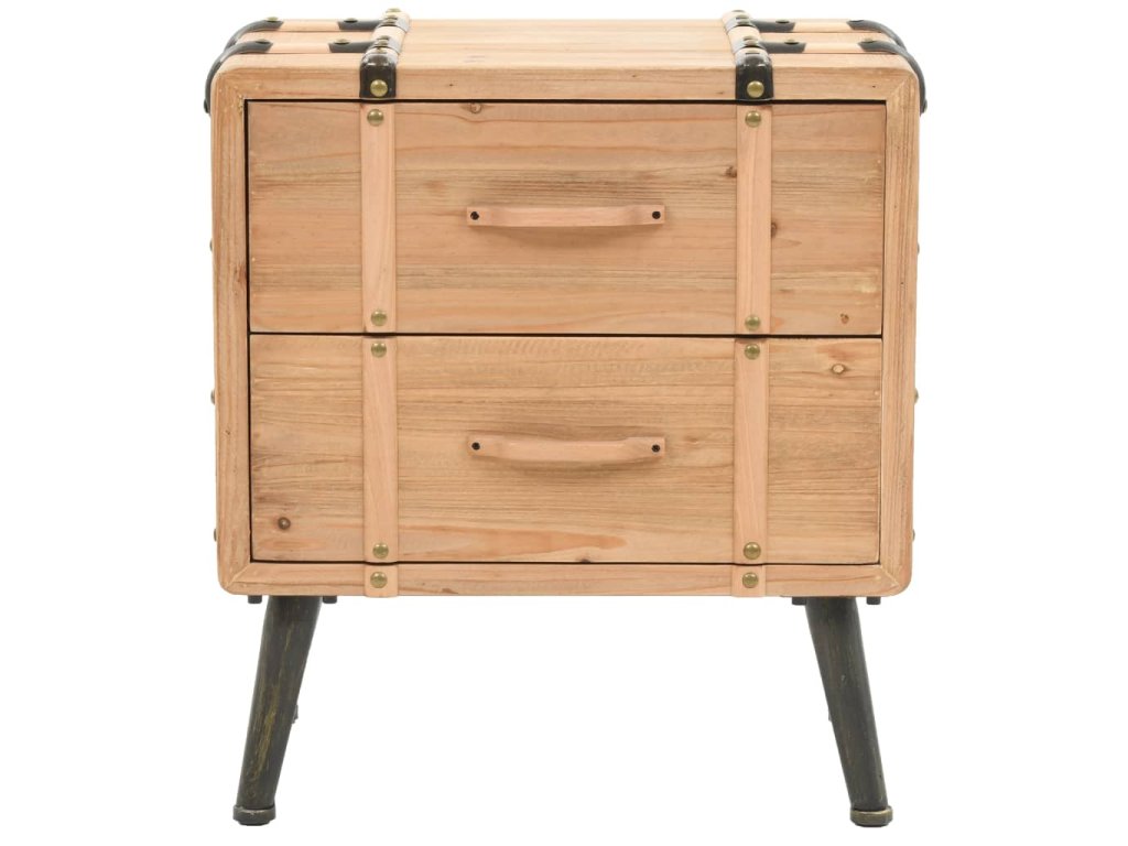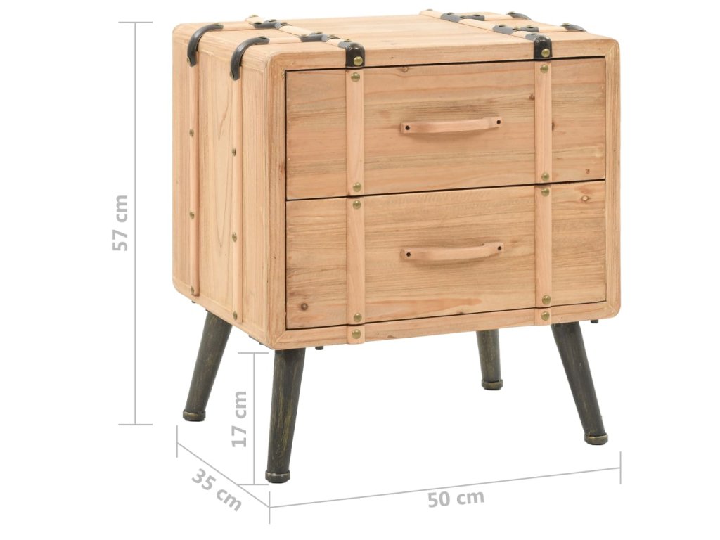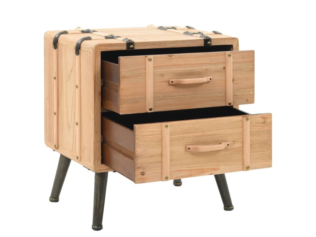 Stabilní a odolný noční stolek je zhotoven z masivního jedlového dřeva. Má robustní stolní desku a dvě zásuvky, jež vám poskytnou spoustu prostoru pro přehledné uspořádání nejrůznějších předmětů, které chcete mít po ruce, jako jsou knihy, brýle, dálkové ovladače apod. Jedinečný design v podobě zavazadla umocňuje celkový vintage styl stolku. Montáž je snadná.