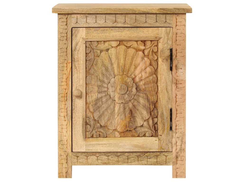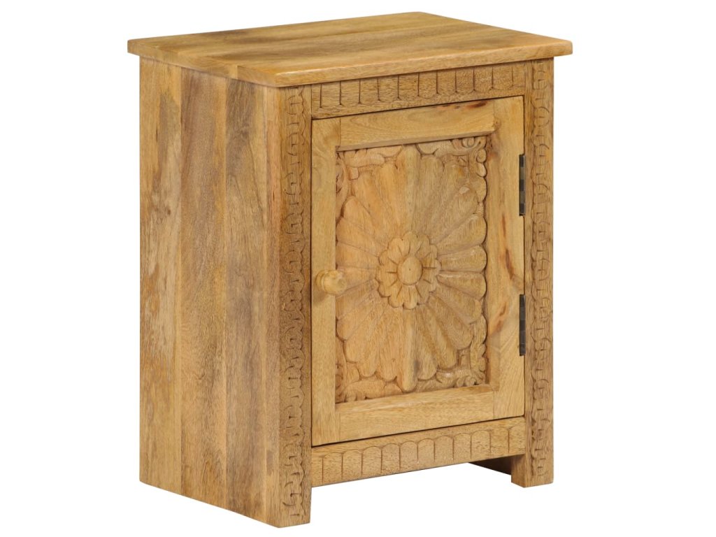 Odkládací stolek je vyroben z masivního mangovníkového dřeva a je vysoce stabilní a odolný. Pevná horní deska je ideální k odložení vašich sklenic, knih, šálků na čaj atd. Noční stolek poskytuje dostatek úložného prostoru pro úhledné uspořádání různých předmětů. Vyřezávané detaily dodávají nočnímu stolku nádech elegantního šarmu. Tento výrobek je dodávaný ve složeném stavu, montáž není nutná.