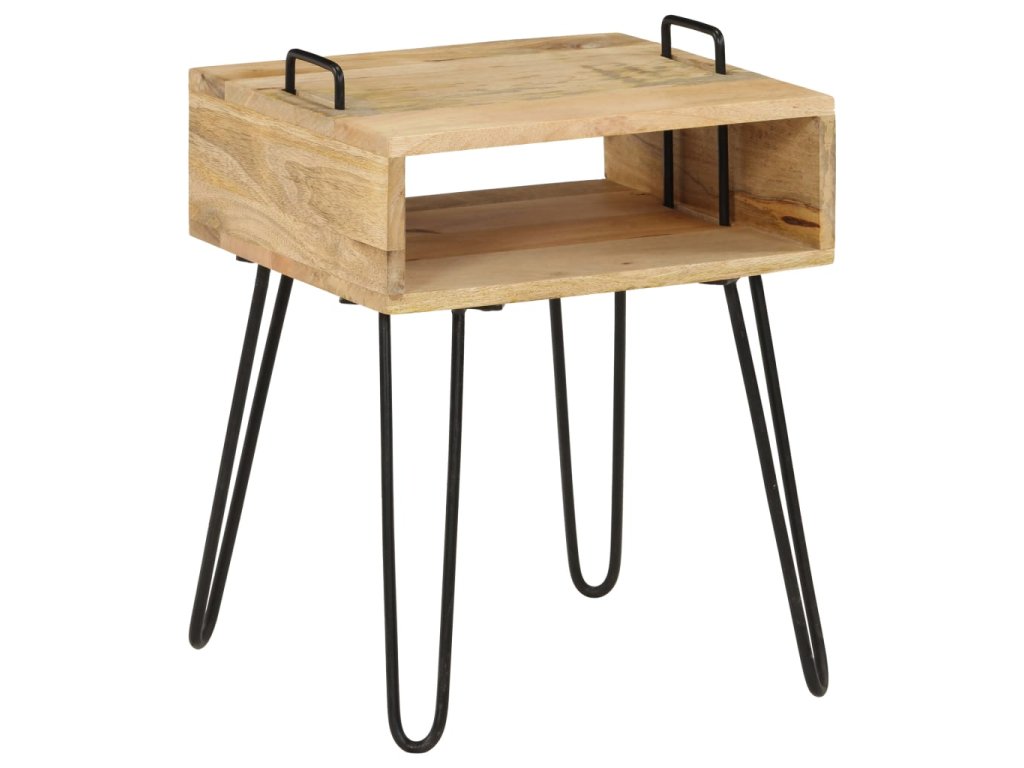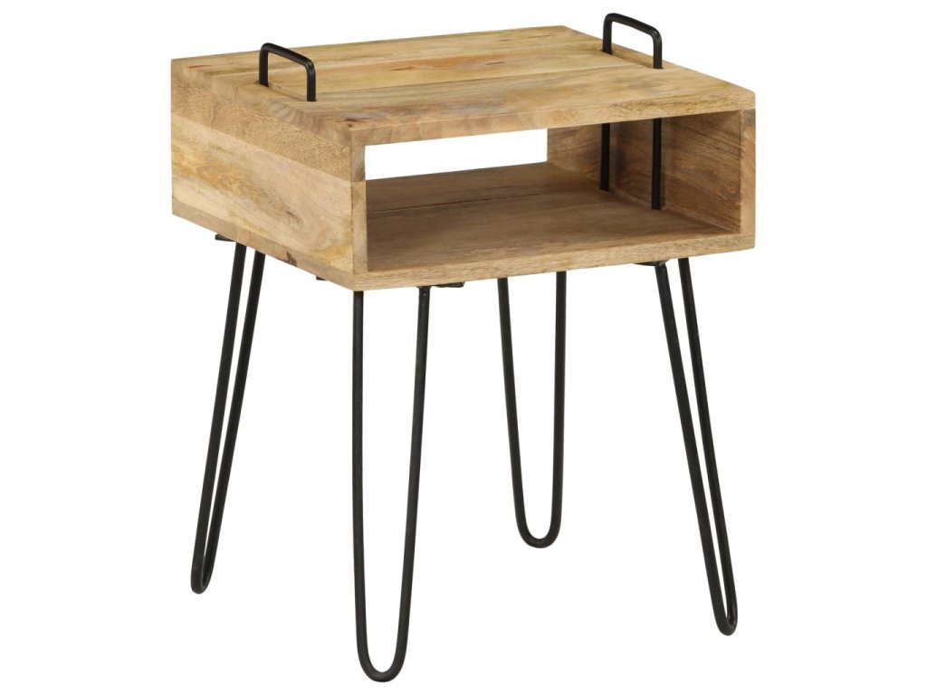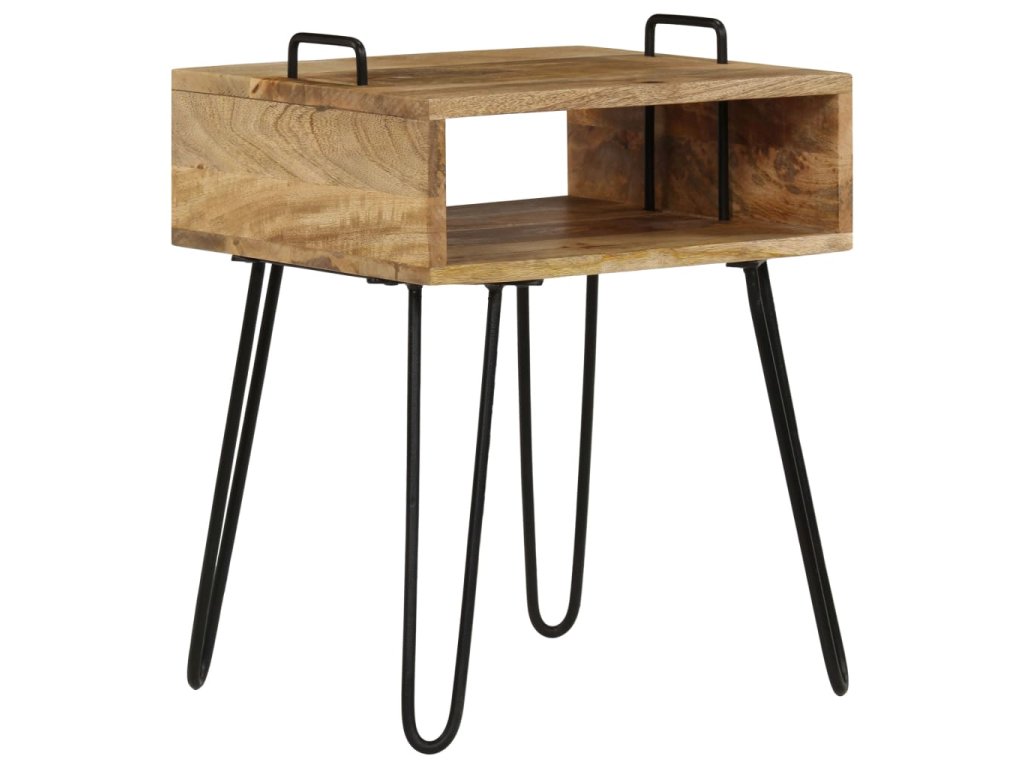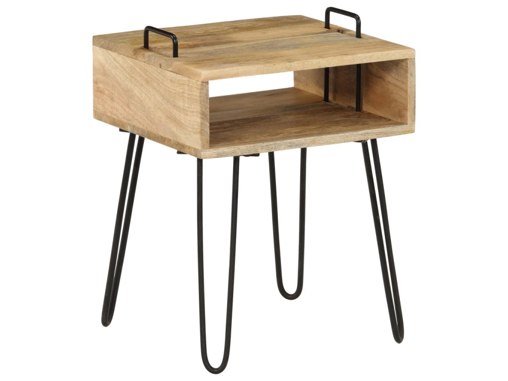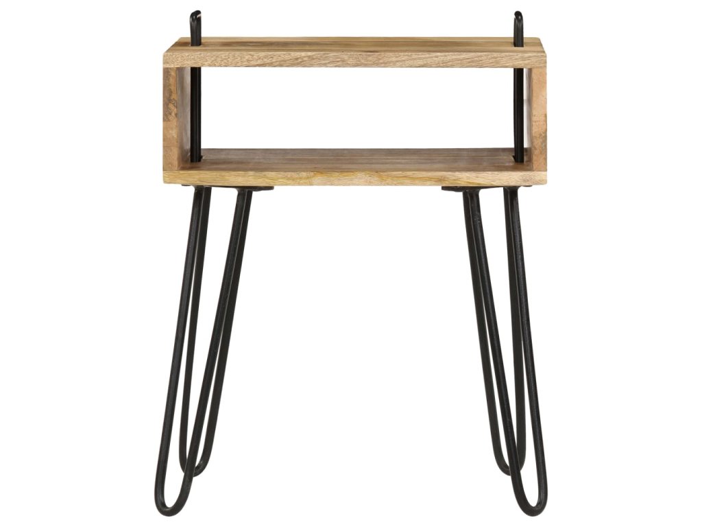 Je vyroben z masivního mangovníku a pevných ocelových rámů, díky kterým je noční stolek vysoce stabilní a odolný. Deska a polička poskytují úložný prostor pro přehledné uložení různých malých předmětů. Ocelové rámy zaručují pevnost stolku a zároveň tvoří jeho industriální styl. Každý krok výrobního procesu je prováděn s největší péčí, ať už je to leštění a lakování. Výrobek je snadné sestavit.