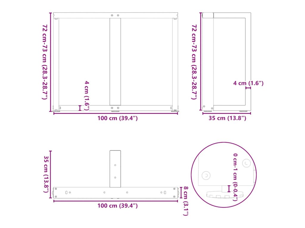 - Praktický design: Tato noha pracovní desky je vybavena nastavitelnými vyrovnávacími nožkami, které zajišťují stabilitu i na nerovných podlahách a minimalizují poškrábání podlahy. Trubka je navíc vybavena předvrtanými otvory a šrouby, které jsou součástí dodávky a kterými lze nohu připevnit k desce stolu (nejsou součástí dodávky), což usnadňuje její montáž.