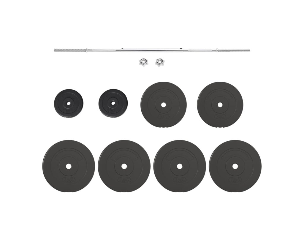 - Hmotnost kotoučů: 4x 10 kg, 2x 5 kg, 2x 2 kg