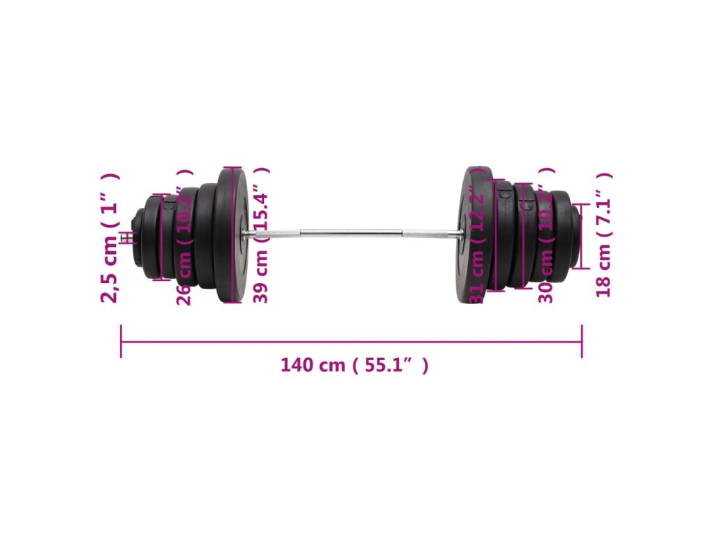 - Rozměry činkové tyče: 25 mm x 140 cm (průměr x D)