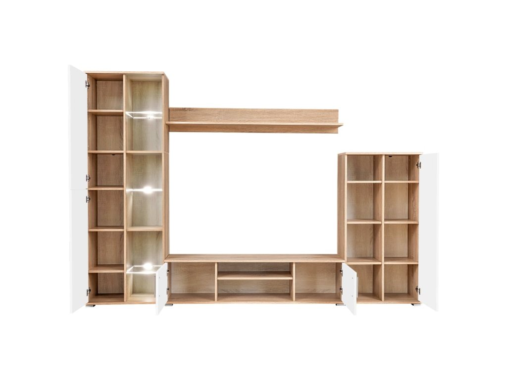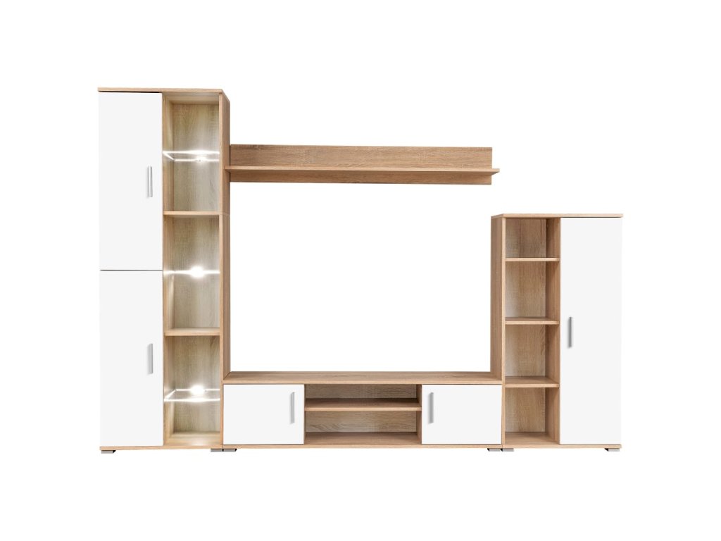 Obývací stěna skládající ze dvou bočních skříněk různých velikostí, TV stolku a nástěnné police poskytuje dostatek prostoru pro ukládání vašich multimediálních zařízení, DVD přehrávače, mediálních nosičů, knih a různých menších předmětů. Je také vhodná pro vystavení dekorativních předmětů, fotorámečků nebo květin. Součástí levé boční vitríny jsou tři skleněné police s energeticky úsporným bílým LED osvětlením, které vytváří příjemnou atmosféru.