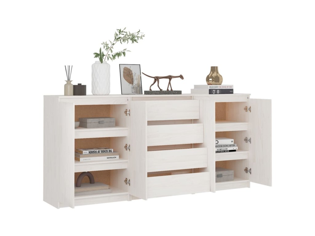 Tyto skříňky jsou vyrobeny z masivního borového dřeva, které zajišťuje jejich pevnost a odolnost. Tuto sadu tvoří 2 skříňky se 2 dvířky a 3 přihrádkami a 1 skříňka se 4 zásuvkami. Poskytují dostatek úložného prostoru pro přehledné uspořádaní všech vašich věcí na dosah ruky. Pevná horní deska je také ideální pro vystavení dekorativních předmětů, fotorámečků nebo pokojových rostlin. Skříňky se navíc snadno čistí vlhkým hadříkem.