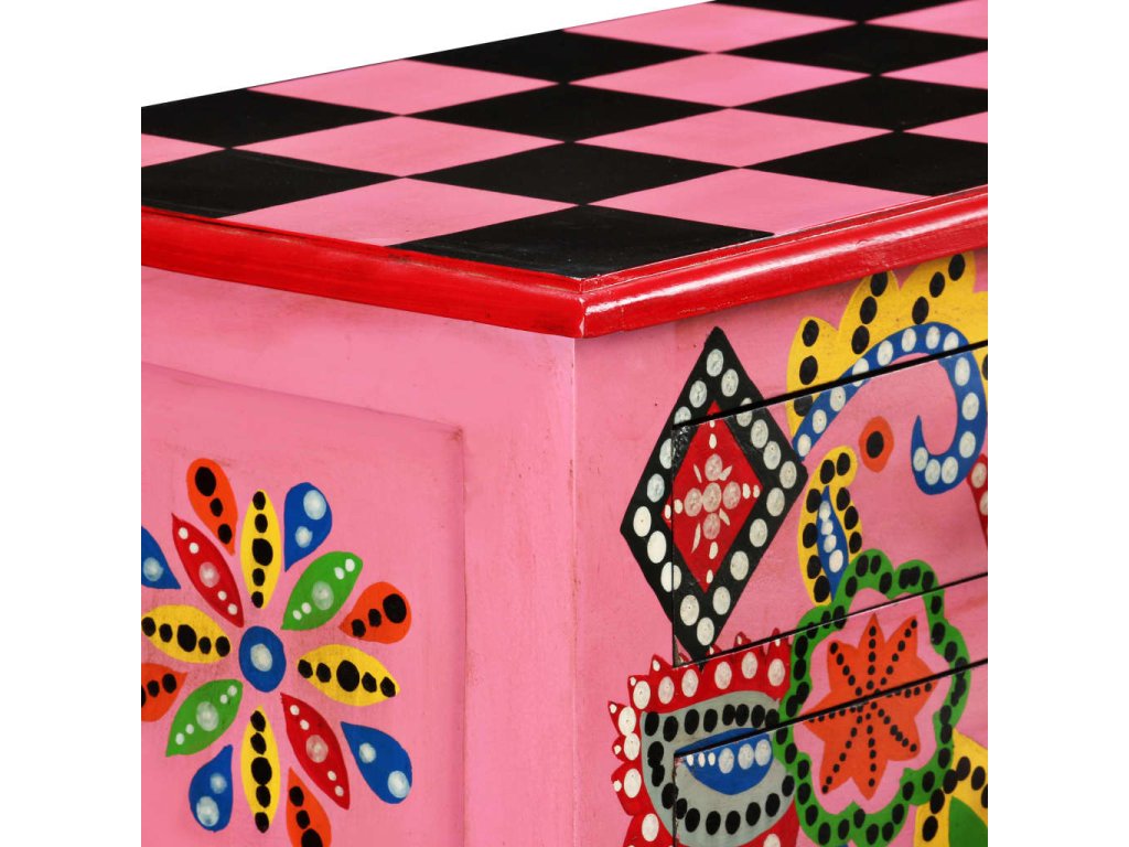 Tento stolek pod TV je vyroben z mangovníkového dřeva, které je nejen líbivé, ale také velmi odolné. Jeho retro vzhled navíc podtrhuje zručné řemeslné zpracování. Stolek je ručně malovaný. Jeho bohaté zdobení z něj činí elegantní, rafinovaný kousek. Úchytky, které se k němu perfektně hodí, usnadňují otevírání zásuvek.