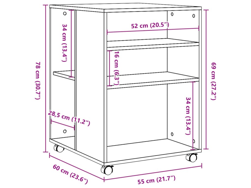 - Snadný pohyb: Tento odkládací stolek lze díky čtyřem otočným kolečkům, která jsou součástí dodávky, snadno přemístit na požadované místo. Dvě kolečka jsou uzamykatelná, což udržuje skříňku na místě a zvyšuje stabilitu.
