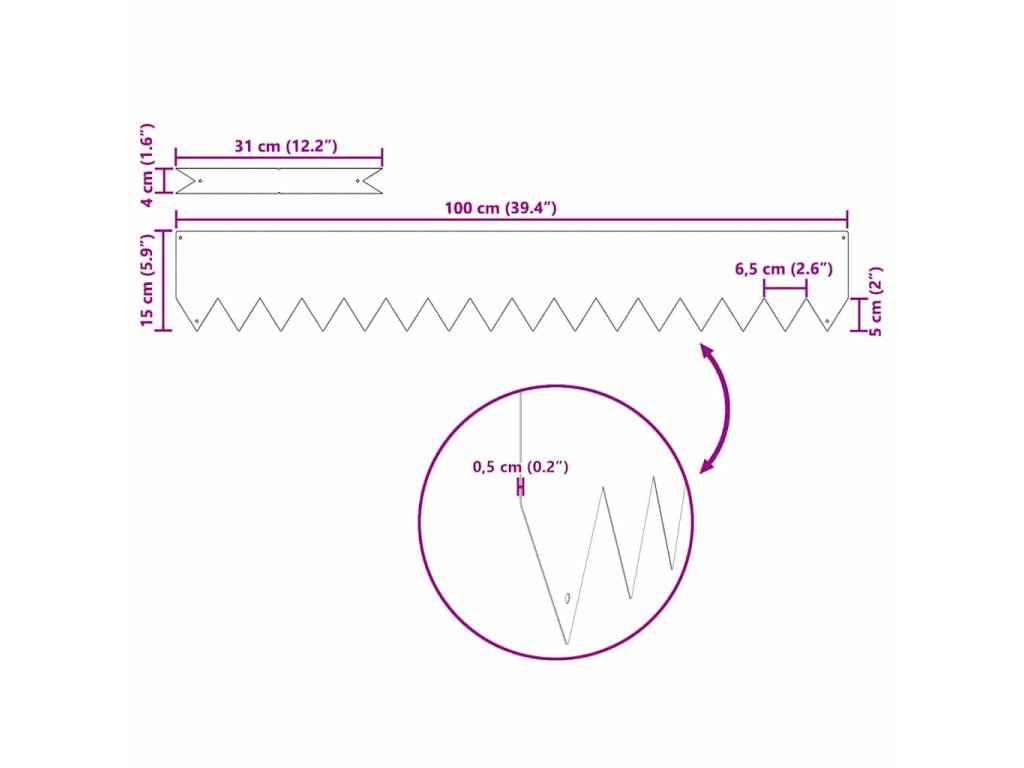 Tento zahradní obrubník je stylové a čisté řešení, jak vymezit prostory venku. Skvěle se hodí na zahrady a terasy a pěkně odděluje trávník, květinové záhony a chodníky, což vytváří úhlednou a příjemnou krajinu. Elegantní design se snadno hodí k různým stylům venkovního dekoru a zlepšuje celkový vzhled vaší zahrady, přičemž usnadňuje údržbu.