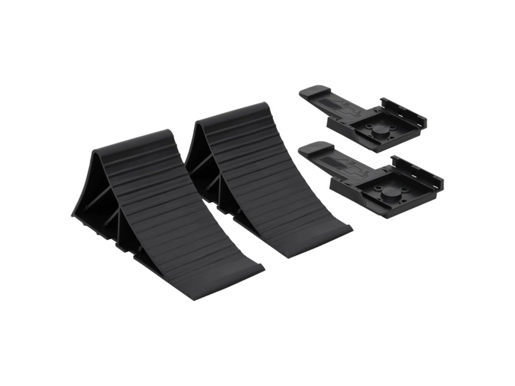 - Klíny pod kola: Důmyslná konstrukce těchto klínů napomáhá jejich snadnému zasunutí v ideálním úhlu. Žebrovaný povrch zajišťuje lepší přilnavost kol, což vám umožňuje udržet auto na místě a zajistit maximální bezpečnost.
