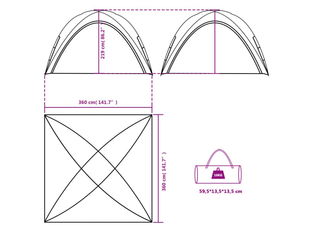 - Rozměry stanu: 360 x 360 x 219 cm (D x Š x H)