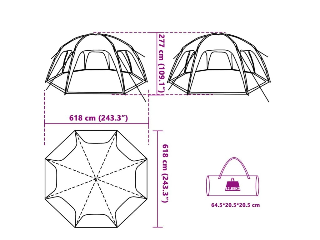 - Rozměry stanu: 618 x 618 x 277 cm (d x š x v)